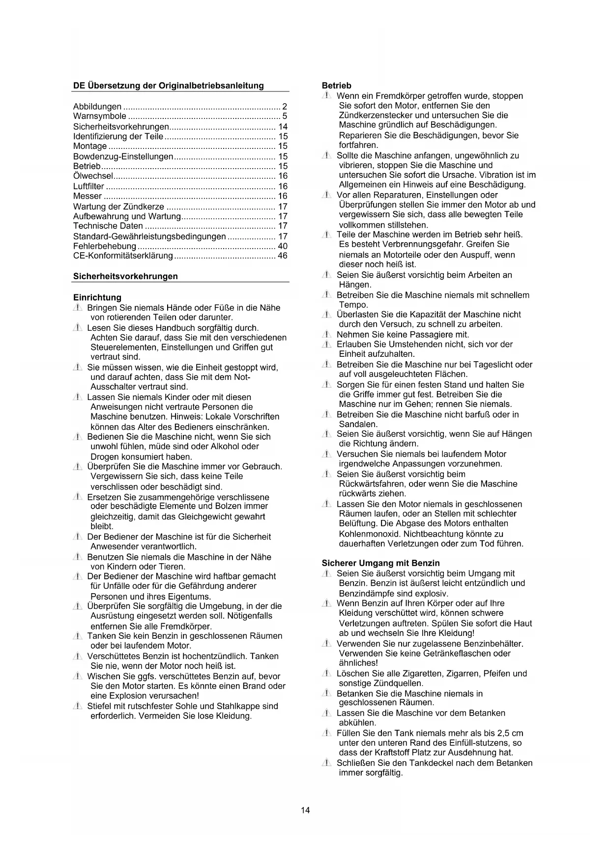 - CE-Konformitätserklärung Sicherheitsvorkehrungen Einrichtung Bringen Sie niemals Hände oder Füße in die Nähe von rotierenden Teilen oder darunter. Lesen Sie dieses Handbuch sorgfältig durch. Achten Sie darauf, dass Sie mit den verschiedenen Steuerelementen, Einstellungen und Griffen gut vertraut sind. Sie müssen wissen, wie die Einheit gestoppt wird, und darauf achten, dass Sie mit dem Not- Ausschalter vertraut sind. Lassen Sie niemals Kinder oder mit diesen Anweisungen nicht vertraute Personen die Maschine benutzen. Hinweis: Lokale Vorschriften können das Alter des Bedieners einschränken. Bedienen Sie die Maschine nicht, wenn Sie sich unwohl fühlen, müde sind oder Alkohol oder Drogen konsumiert haben. Überprüfen Sie die Maschine immer vor Gebrauch. Vergewissern Sie sich, dass keine Teile verschlissen oder beschädigt sind. Ersetzen Sie zusammengehörige verschlissene oder beschädigte Elemente und Bolzen immer gleichzeitig, damit das Gleichgewicht gewahrt bleibt. Der Bediener der Maschine ist für die Sicherheit Anwesender verantwortlich. Benutzen Sie niemals die Maschine in der Nähe von Kindern oder Tieren. Der Bediener der Maschine wird haftbar gemacht für Unfälle oder für die Gefährdung anderer Personen und ihres Eigentums. Überprüfen Sie sorgfältig die Umgebung, in der die Ausrüstung eingesetzt werden soll. Nötigenfalls entfernen Sie alle Fremdkörper. Tanken Sie kein Benzin in geschlossenen Räumen oder bei laufendem Motor. Verschüttetes Benzin ist hochentzündlich. Tanken Sie nie, wenn der Motor noch heiß ist. Wischen Sie ggfs. verschüttetes Benzin auf, bevor Sie den Motor starten. Es könnte einen Brand oder eine Explosion verursachen! Stiefel mit rutschfester Sohle und Stahlkappe sind erforderlich. Vermeiden Sie lose Kleidung. p. 46