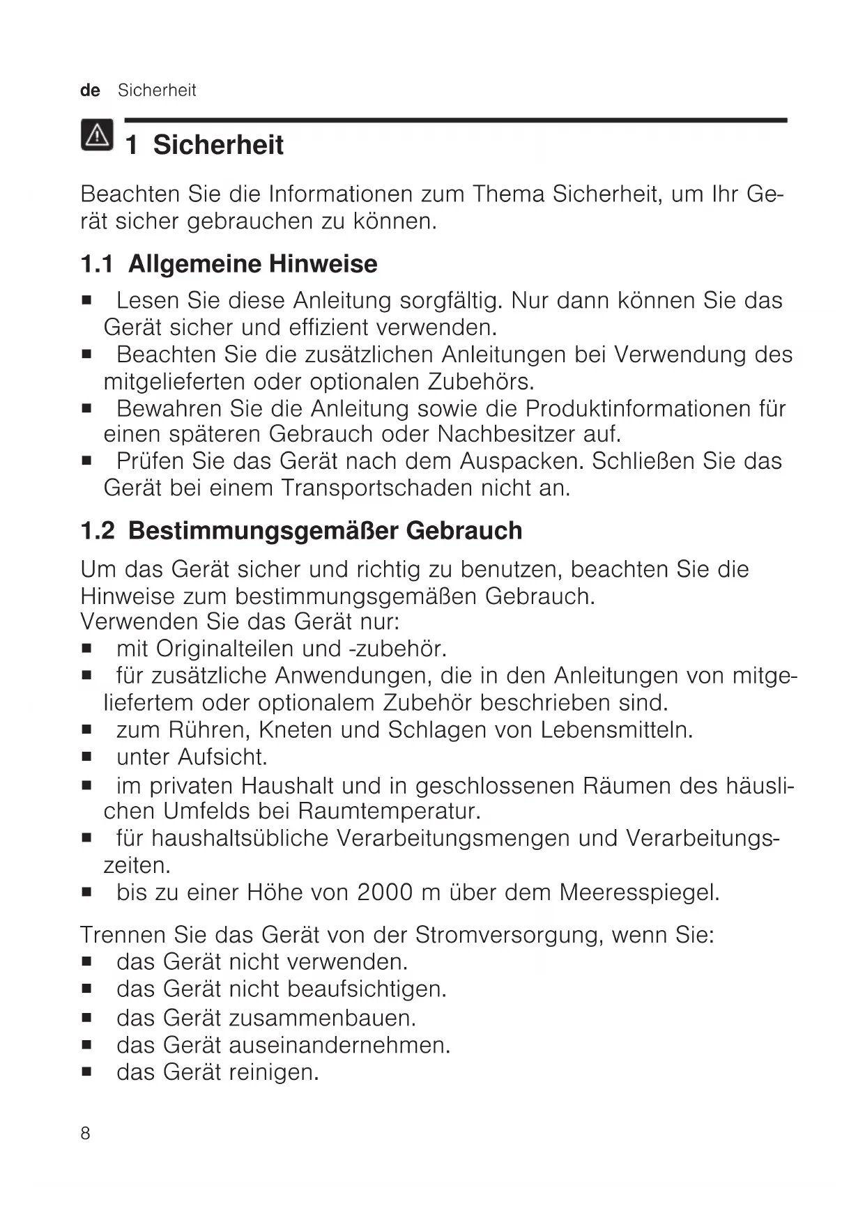1 Sicherheit Beachten Sie die Informationen zum Thema Sicherheit, um Ihr Ge- rät sicher gebrauchen zu können. 1.1 Allgemeine Hinweise ¡ Lesen Sie diese Anleitung sorgfältig. Nur dann können Sie das Gerät sicher und effizient verwenden. ¡ Beachten Sie die zusätzlichen Anleitungen bei Verwendung des mitgelieferten oder optionalen Zubehörs. ¡ Bewahren Sie die Anleitung sowie die Produktinformationen für einen späteren Gebrauch oder Nachbesitzer auf. ¡ Prüfen Sie das Gerät nach dem Auspacken. Schließen Sie das Gerät bei einem Transportschaden nicht an. 1.2 Bestimmungsgemäßer Gebrauch Um das Gerät sicher und richtig zu benutzen, beachten Sie die Hinweise zum bestimmungsgemäßen Gebrauch. Verwenden Sie das Gerät nur: ¡ mit Originalteilen und -zubehör. ¡ für zusätzliche Anwendungen, die in den Anleitungen von mitge- liefertem oder optionalem Zubehör beschrieben sind. ¡ zum Rühren, Kneten und Schlagen von Lebensmitteln. ¡ unter Aufsicht. ¡ im privaten Haushalt und in geschlossenen Räumen des häusli- chen Umfelds bei Raumtemperatur. ¡ für haushaltsübliche Verarbeitungsmengen und Verarbeitungs- zeiten. ¡ bis zu einer Höhe von 2000m über dem Meeresspiegel. Trennen Sie das Gerät von der Stromversorgung, wenn Sie: ¡ das Gerät nicht verwenden. ¡ das Gerät nicht beaufsichtigen. ¡ das Gerät zusammenbauen. ¡ das Gerät auseinandernehmen. ¡ das Gerät reinigen.Sicherheit de
