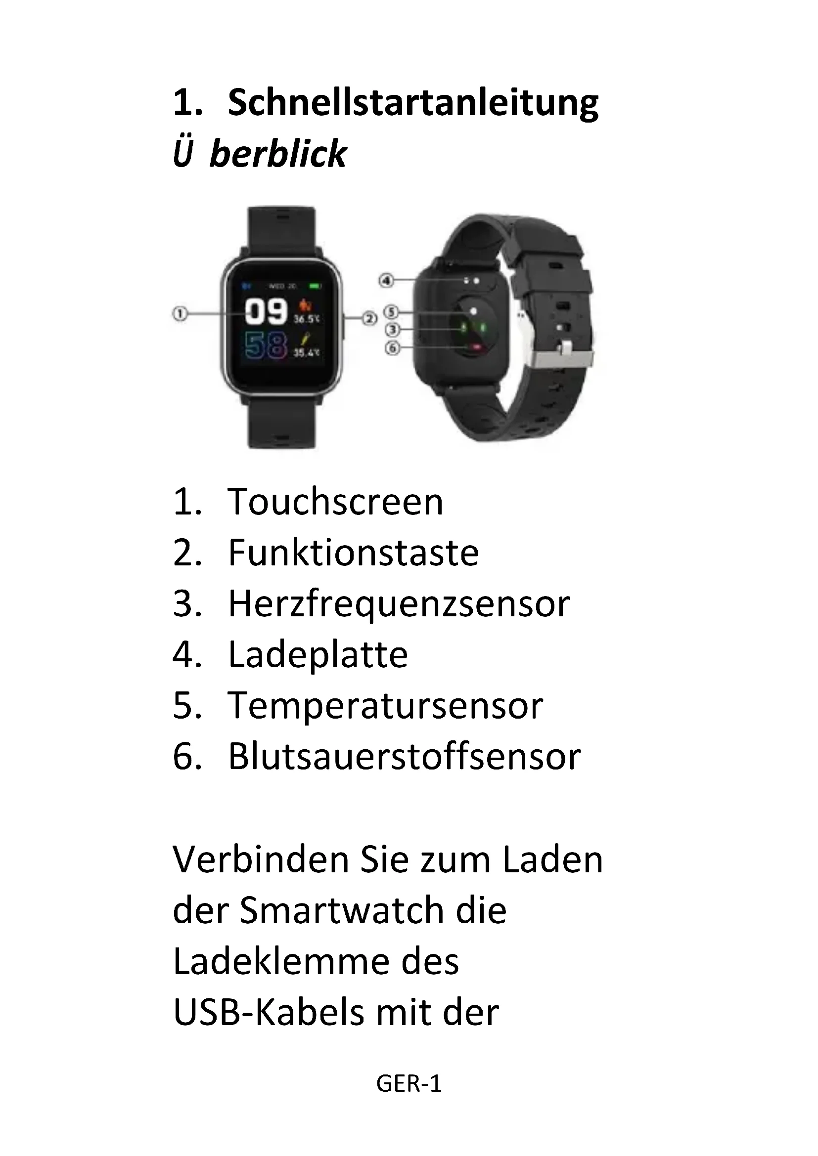 Verbinden Sie zum Laden der Smartwatch die Ladeklemme des USB-Kabels mit derGER-2 Ladeplatte auf der Rückseite der Smartwatch. Wenn die Verbindung erfolgreich war, dann erscheint auf dem Display das Ladesymbol.