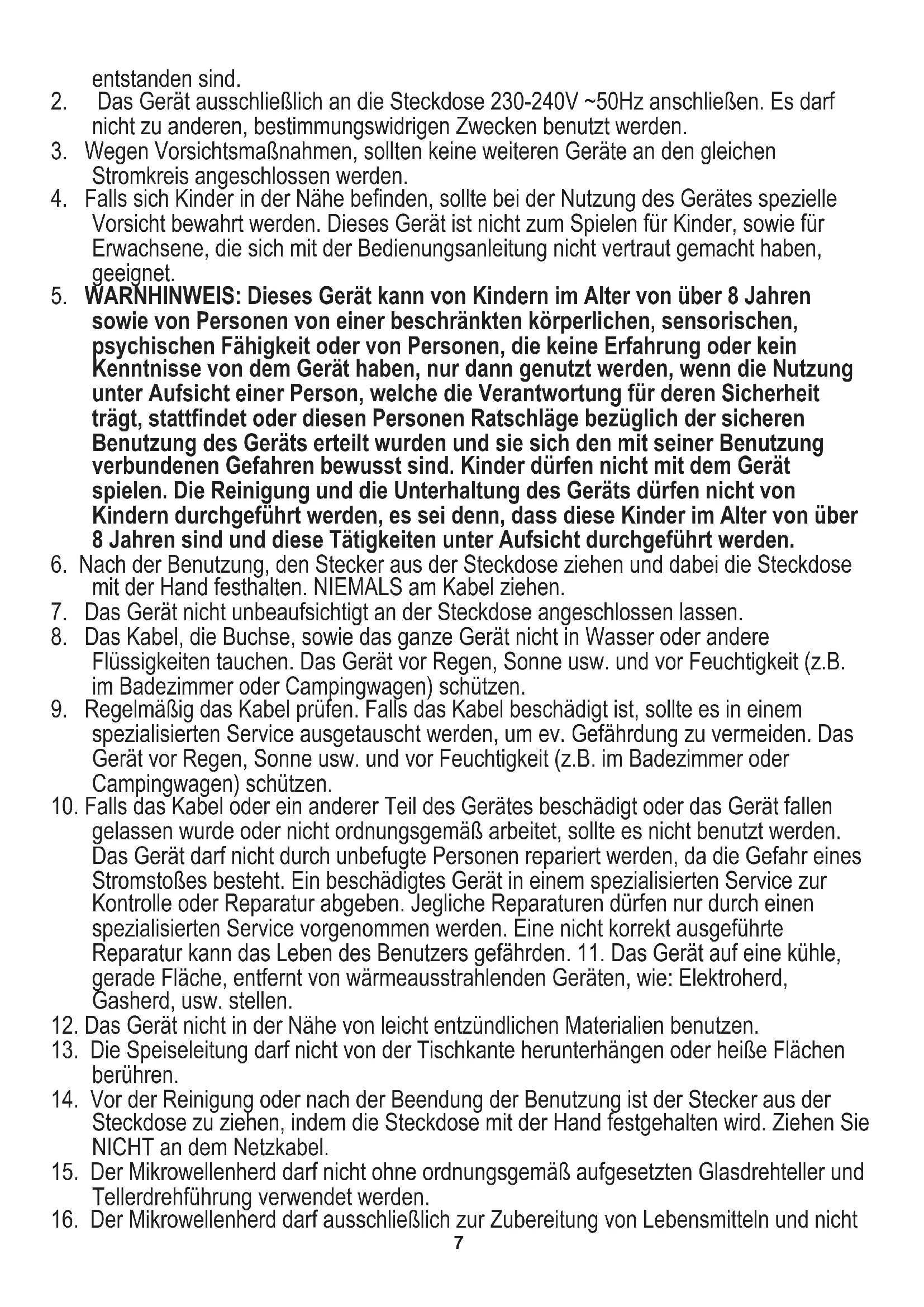 16. Der Mikrowellenherd darf ausschließlich zur Zubereitung von Lebensmitteln und nicht