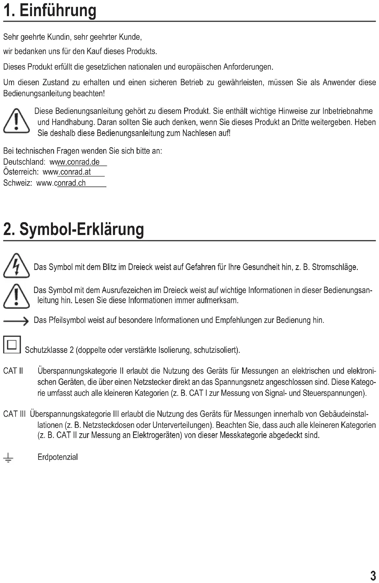 Das Symbol mit dem Blitz im Dreieck weist auf Gefahren für Ihre Gesundheit hin, z. B. Stromschläge. Das Symbol mit dem Ausrufezeichen im Dreieck weist auf wichtige Informationen in dieser Bedienungsan- leitung hin. Lesen Sie diese Informationen immer aufmerksam. Das Pfeilsymbol weist auf besondere Informationen und Empfehlungen zur Bedienung hin. Schutzklasse 2 (doppelte oder verstärkte Isolierung, schutzisoliert). CAT II Überspannungskategorie II erlaubt die Nutzung des Geräts für Messungen an elektrischen und elektroni- schen Geräten, die über einen Netzstecker direkt an das Spannungsnetz angeschlossen sind. Diese Katego- rie umfasst auch alle kleineren Kategorien (z. B. CAT I zur Messung von Signal- und Steuerspannungen). CAT III Überspannungskategorie III erlaubt die Nutzung des Geräts für Messungen innerhalb von Gebäudeinstal- lationen (z. B. Netzsteckdosen oder Unterverteilungen). Beachten Sie, dass auch alle kleineren Kategorien (z. B. CAT II zur Messung an Elektrogeräten) von dieser Messkategorie abgedeckt sind. Erdpotenzial4
