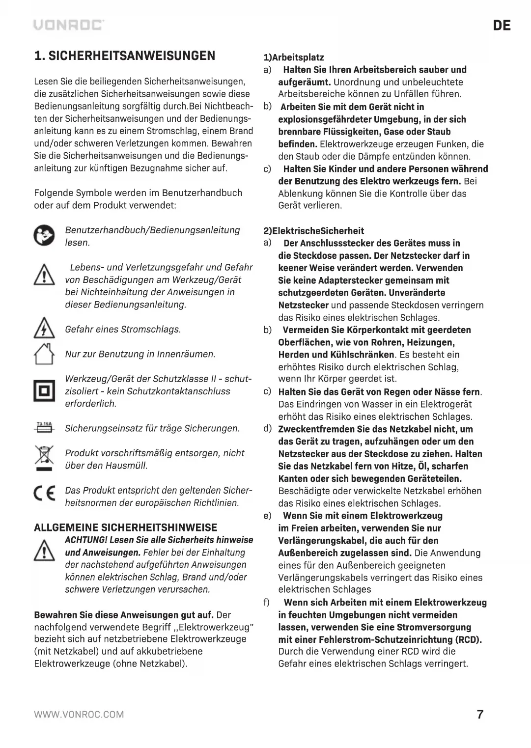 Lesen Sie die beiliegenden Sicherheitsanweisungen, die zusätzlichen Sicherheitsanweisungen sowie diese Bedienungsanleitung sorgfältig durch.Bei Nichtbeach- ten der Sicherheitsanweisungen und der Bedienungs- anleitung kann es zu einem Stromschlag, einem Brand und/oder schweren Verletzungen kommen. Bewahren Sie die Sicherheitsanweisungen und die Bedienungs- anleitung zur künftigen Bezugnahme sicher auf. Folgende Symbole werden im Benutzerhandbuch oder auf dem Produkt verwendet: Benutzerhandbuch/Bedienungsanleitung lesen. Lebens- und Verletzungsgefahr und Gefahr von Beschädigungen am Werkzeug/Gerät bei Nichteinhaltung der Anweisungen in dieser Bedienungsanleitung. Gefahr eines Stromschlags. Nur zur Benutzung in Innenräumen. Werkzeug/Gerät der Schutzklasse II - schut- zisoliert - kein Schutzkontaktanschluss erforderlich. Sicherungseinsatz für träge Sicherungen. Produkt vorschriftsmäßig entsorgen, nicht über den Hausmüll. Das Produkt entspricht den geltenden Sicher- heitsnormen der europäischen Richtlinien. ALLGEMEINE SICHERHEITSHINWEISE ACHTUNG! Lesen Sie alle Sicherheits hinweise und Anweisungen. Fehler bei der Einhaltung der nachstehend aufgeführten Anweisungen können elektrischen Schlag, Brand und/oder schwere Verletzungen verursachen. Bewahren Sie diese Anweisungen gut auf. Der nachfolgend verwendete Begriff ,,Elektrowerkzeug” bezieht sich auf netzbetriebene Elektrowerkzeuge (mit Netzkabel) und auf akkubetriebene Elektrowerkzeuge (ohne Netzkabel).