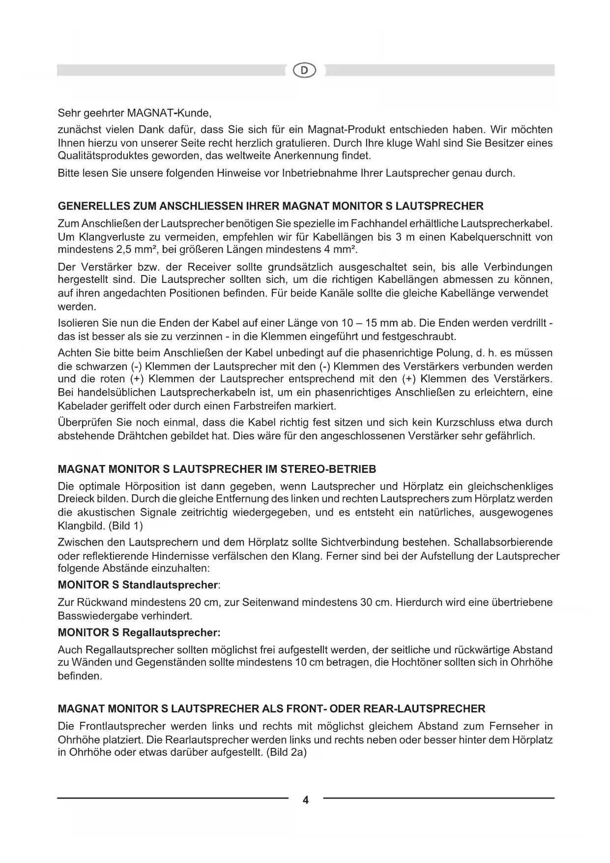 Die optimale Hörposition ist dann gegeben, wenn Lautsprecher und Hörplatz ein gleichschenkliges Dreieck bilden. Durch die gleiche Entfernung des linken und rechten Lautsprechers zum Hörplatz werden die akustischen Signale zeitrichtig wiedergegeben, und es entsteht ein natürliches, ausgewogenes Klangbild. (Bild 1) Zwischen den Lautsprechern und dem Hörplatz sollte Sichtverbindung bestehen. Schallabsorbierende oder reektierende Hindernisse verfälschen den Klang. Ferner sind bei der Aufstellung der Lautsprecher folgende Abstände einzuhalten: MONITOR S Standlautsprecher: Zur Rückwand mindestens 20 cm, zur Seitenwand mindestens 30 cm. Hierdurch wird eine übertriebene Basswiedergabe verhindert. MONITOR S Regallautsprecher: Auch Regallautsprecher sollten möglichst frei aufgestellt werden, der seitliche und rückwärtige Abstand zu Wänden und Gegenständen sollte mindestens 10 cm betragen, die Hochtöner sollten sich in Ohrhöhe benden. MAGNAT MONITOR S LAUTSPRECHER ALS FRONT- ODER REAR-LAUTSPRECHER Die Frontlautsprecher werden links und rechts mit möglichst gleichem Abstand zum Fernseher in Ohrhöhe platziert. Die Rearlautsprecher werden links und rechts neben oder besser hinter dem Hörplatz in Ohrhöhe oder etwas darüber aufgestellt. (Bild 2a)5 MONITOR S 30, S 10 D, S 10 B: Im Setup des AV-Receivers sollte die Übergangsfrequenz der Front- und Rearkanäle wenn möglich auf ca. 80 Hz gestellt werden. Ansonsten gelten die Empfehlungen im vorigen Kapitel.