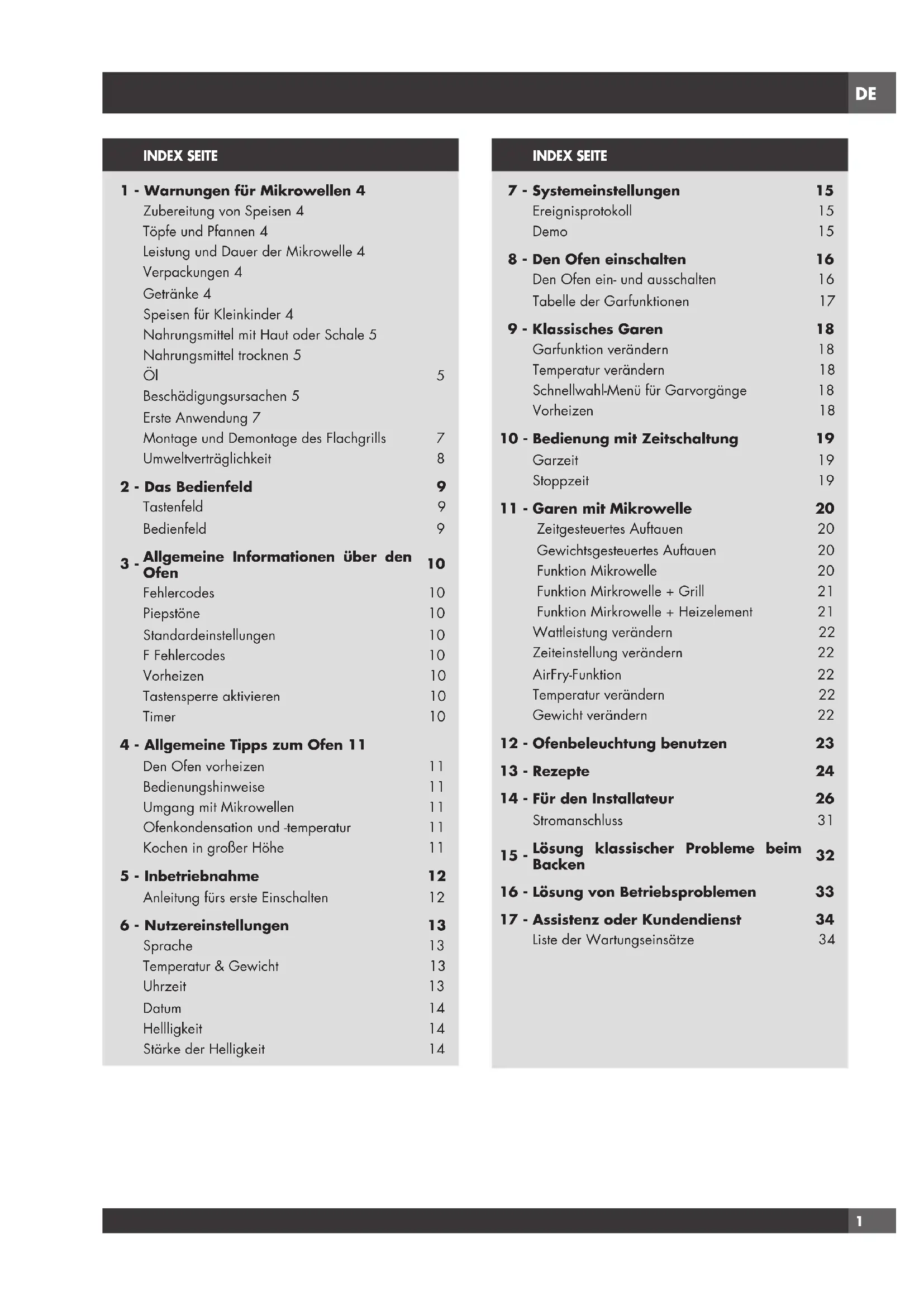 Zubereitung von Speisen 4 Töpfe und Pfannen 4 Leistung und Dauer der Mikrowelle 4 Verpackungen 4 Getränke 4 Speisen für Kleinkinder 4 Nahrungsmittel mit Haut oder Schale 5 Nahrungsmittel trocknen 5 Öl 5 Beschädigungsursachen 5 Erste Anwendung 7 Montage und Demontage des Flachgrills 7 Umweltverträglichkeit 8