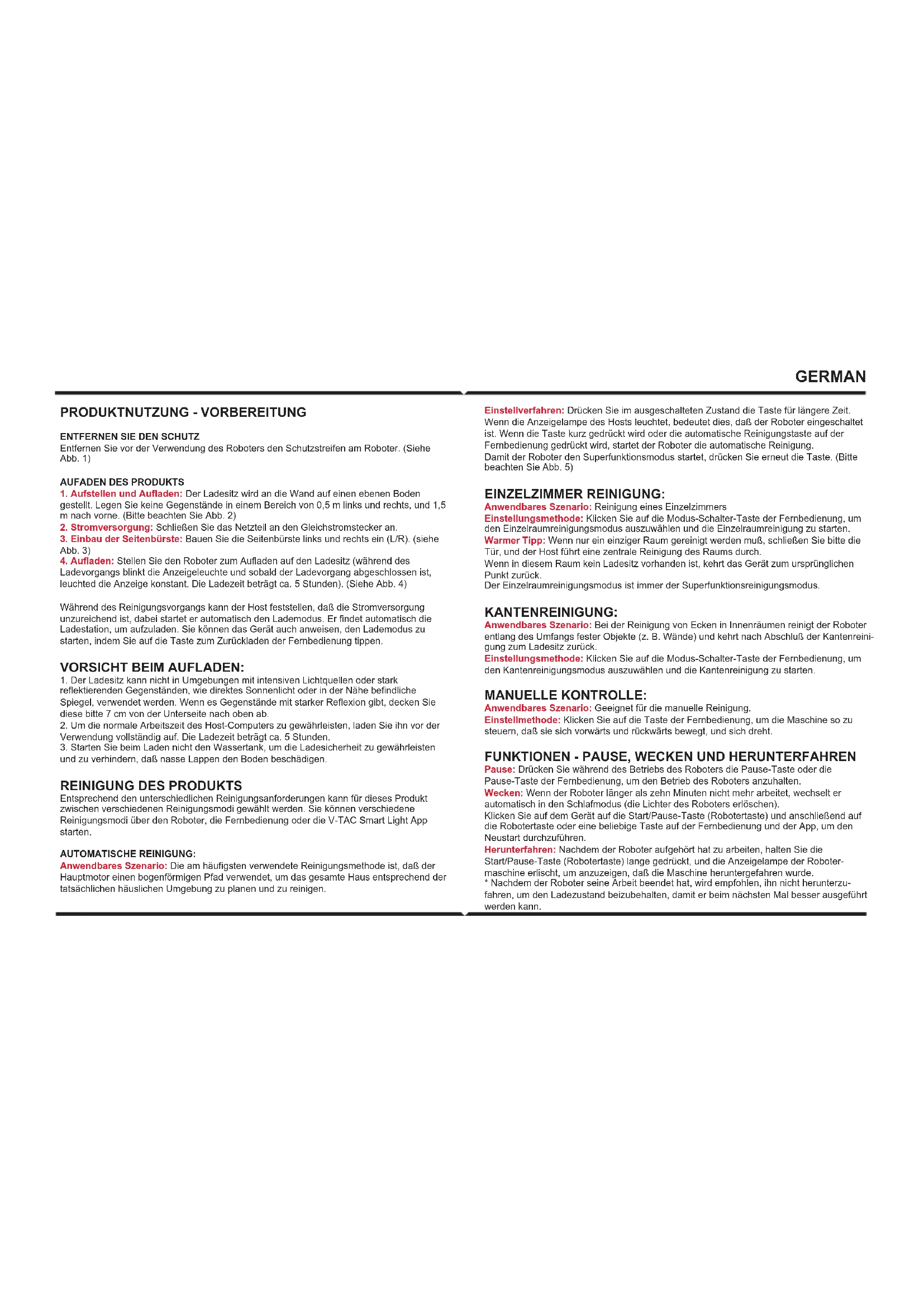 Entsprechend den unterschiedlichen Reinigungsanforderungen kann für dieses Produkt zwischen verschiedenen Reinigungsmodi gewählt werden. Sie können verschiedene Reinigungsmodi über den Roboter, die Fernbedienung oder die V-TAC Smart Light App starten. AUTOMATISCHE REINIGUNG: Anwendbares Szenario: Die am häufigsten verwendete Reinigungsmethode ist, daß der Hauptmotor einen bogenförmigen Pfad verwendet, um das gesamte Haus entsprechend der tatsächlichen häuslichen Umgebung zu planen und zu reinigen. GERMANJ. Den Staubbehälterdeckel abdecken und die Staubbox am Roboter installieren. Hinweis: Lassen Sie beim Reinigen kein Wasser in den Lüfteranschluß eindringen.