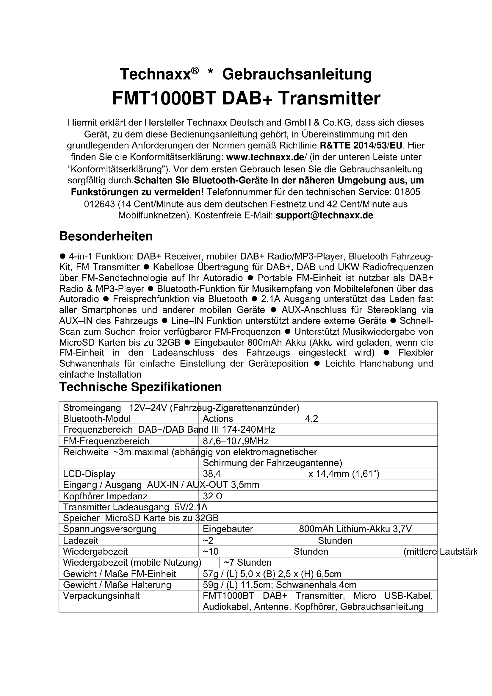 - Gebrauchsanleitung FMT1000BT DAB+ Transmitter Hiermit erklärt der Hersteller Technaxx Deutschland GmbH & Co.KG, dass sich dieses Gerät, zu dem diese Bedienungsanleitung gehört, in Übereinstimmung mit den grundlegenden Anforderungen der Normen gemäß Richtlinie R&TTE 2014/53/EU. Hier finden Sie die Konformitätserklärung: www.technaxx.de/ (in der unteren Leiste unter “Konformitätserklärung”). Vor dem ersten Gebrauch lesen Sie die Gebrauchsanleitung sorgfältig durch.Schalten Sie Bluetooth-Geräte in der näheren Umgebung aus, um Funkstörungen zu vermeiden! Telefonnummer für den technischen Service: 01805 012643 (14 Cent/Minute aus dem deutschen Festnetz und 42 Cent/Minute aus Mobilfunknetzen). Kostenfreie E-Mail: support@technaxx.de Besonderheiten 4-in-1 Funktion: DAB+ Receiver, mobiler DAB+ Radio/MP3-Player, Bluetooth Fahrzeug- Kit, FM Transmitter Kabellose Übertragung für DAB+, DAB und UKW Radiofrequenzen über FM-Sendtechnologie auf Ihr Autoradio Portable FM-Einheit ist nutzbar als DAB+ Radio & MP3-Player Bluetooth-Funktion für Musikempfang von Mobiltelefonen über das Autoradio Freisprechfunktion via Bluetooth 2.1A Ausgang unterstützt das Laden fast aller Smartphones und anderer mobilen Geräte AUX-Anschluss für Stereoklang via AUX–IN des Fahrzeugs Line–IN Funktion unterstützt andere externe Geräte Schnell- Scan zum Suchen freier verfügbarer FM-Frequenzen Unterstützt Musikwiedergabe von MicroSD Karten bis zu 32GB Eingebauter 800mAh Akku (Akku wird geladen, wenn die FM-Einheit in den Ladeanschluss des Fahrzeugs eingesteckt wird) Flexibler Schwanenhals für einfache Einstellung der Geräteposition Leichte Handhabung und einfache Installation Technische Spezifikationen Stromeingang 12V–24V (Fahrzeug-Zigarettenanzünder) Bluetooth-Modul Actions 4.2 Frequenzbereich DAB+/DAB Band III 174-240MHz FM-Frequenzbereich 87,6–107,9MHz Reichweite ~3m maximal (abhängig von elektromagnetischer Schirmung der Fahrzeugantenne) LCD-Display 38,4 x 14,4mm (1,61“) Eingang / Ausgang AUX-IN / AUX-OUT 3,5mm Kopfhörer Impedanz 32 Ω Transmitter Ladeausgang 5V/2.1A Speicher MicroSD Karte bis zu 32GB Spannungsversorgung Eingebauter 800mAh Lithium-Akku 3,7V Ladezeit ~2 Stunden Wiedergabezeit ~10 Stunden (mittlere Lautstärke) Wiedergabezeit (mobile Nutzung) ~7 Stunden Gewicht / Maße FM-Einheit 57g / (L) 5,0 x (B) 2,5 x (H) 6,5cm Gewicht / Maße Halterung 59g / (L) 11,5cm; Schwanenhals 4cm Verpackungsinhalt FMT1000BT DAB+ Transmitter, Micro USB-Kabel, Audiokabel, Antenne, Kopfhörer, GebrauchsanleitungLaden (2 Methoden) (1) Akku der FM-Einheit laden: Die FM-Dockingstation steckt im Zigarettenanzünder Ihres Fahrzeuges. Legen Sie nun die FM-Einheit in die Dockingstation, sie rastet magnetisch ein (achten Sie auf die korrekte Ausrichtung der Kontakte). Der Akku wird nun automatisch geladen, unabhängig davon, ob die FM-Einheit ein- oder ausgeschaltet ist. Zuhause schließen Sie das Micro USB-Kabel* (*im Lieferumfang) an der FM-Einheit und an einem Netzteil** (**nicht im Lieferumfang) an. Der Akku wird geladen unabhängig davon, ob die FM-Einheit ein- oder ausgeschaltet ist. Der Ausgang des Netzteils muss 5V/500mAh betragen. Hinweis: Um den Ladestand des Akkus im ausgeschalteten Zustand zu überprüfen, entfernen Sie das Ladekabel und schalten das Gerät ein. Die Batterieanzeige oben rechts auf dem Bildschirm zeigt den Status an: 3 Balken 100%–70%, 2 Balken 70%–40%, 1 Balken 40%–10%, kein Balken 10%-0%. (2) Laden anderer Geräte unterwegs im Auto: Ist die Dockingstation über den Zigarettenanzünder eines Fahrzeugs versorgt, so schließen Sie Ihr Mobiltelefon über ein USB-Kabel*** (***nicht im Lieferumfang) an der Dockingstation an. Dieses Gerät dient als mobiles Telefonladegerät. Der Ausgang beträgt 5V/2.1A mit 10W. Überblick