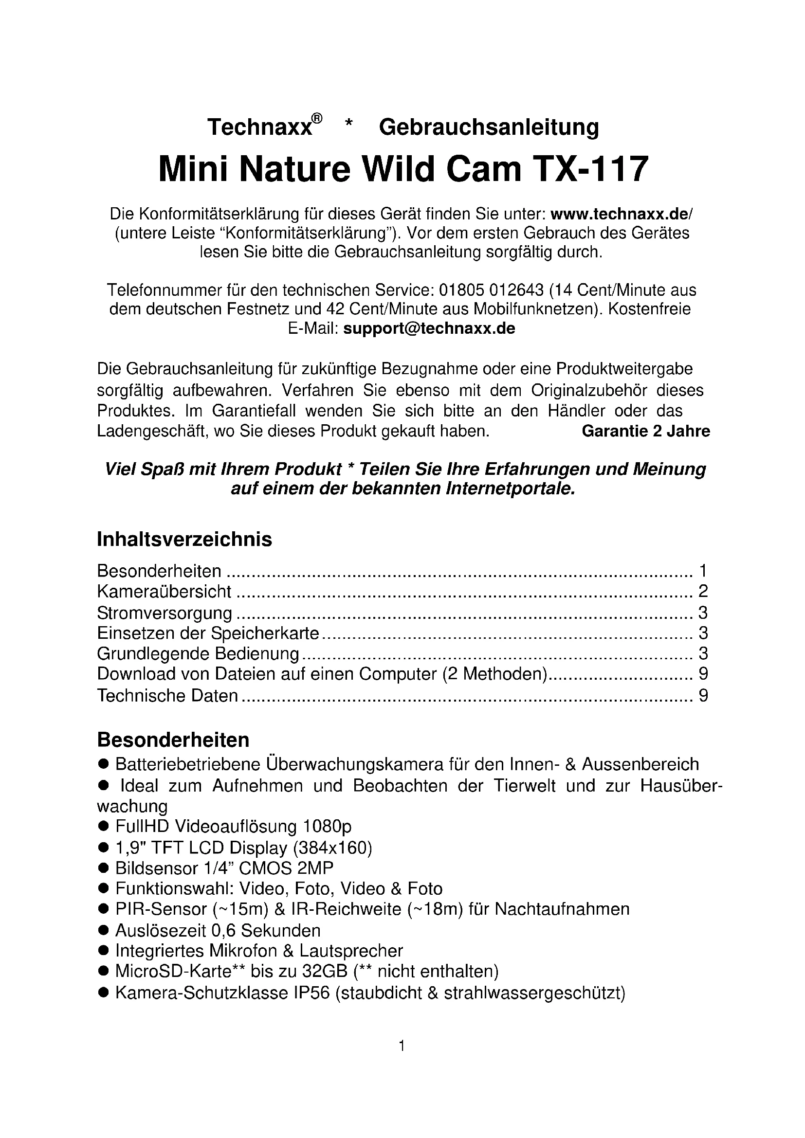 - Gebrauchsanleitung Mini Nature Wild Cam TX-117 Die Konformitätserklärung für dieses Gerät finden Sie unter: www.technaxx.de/ (untere Leiste “Konformitätserklärung”). Vor dem ersten Gebrauch des Gerätes lesen Sie bitte die Gebrauchsanleitung sorgfältig durch. Telefonnummer für den technischen Service: 01805 012643 (14 Cent/Minute aus dem deutschen Festnetz und 42 Cent/Minute aus Mobilfunknetzen). Kostenfreie E-Mail: support@technaxx.de Die Gebrauchsanleitung für zukünftige Bezugnahme oder eine Produktweitergabe sorgfältig aufbewahren. Verfahren Sie ebenso mit dem Originalzubehör dieses Produktes. Im Garantiefall wenden Sie sich bitte an den Händler oder das Ladengeschäft, wo Sie dieses Produkt gekauft haben. Garantie 2 Jahre Viel Spaß mit Ihrem Produkt * Teilen Sie Ihre Erfahrungen und Meinung auf einem der bekannten Internetportale. Inhaltsverzeichnis Besonderheiten ............................................................................................. 1 Kameraübersicht ........................................................................................... 2 Stromversorgung ........................................................................................... 3 Einsetzen der Speicherkarte.......................................................................... 3 Grundlegende Bedienung.............................................................................. 3 Download von Dateien auf einen Computer (2 Methoden)............................. 9 Technische Daten.......................................................................................... 9 Besonderheiten Batteriebetriebene Überwachungskamera für den Innen- & Aussenbereich Ideal zum Aufnehmen und Beobachten der Tierwelt und zur Hausüber- wachung FullHD Videoauflösung 1080p 1,9" TFT LCD Display (384x160) Bildsensor 1/4” CMOS 2MP Funktionswahl: Video, Foto, Video & Foto PIR-Sensor (~15m) & IR-Reichweite (~18m) für Nachtaufnahmen Auslösezeit 0,6 Sekunden Integriertes Mikrofon & Lautsprecher MicroSD-Karte** bis zu 32GB (** nicht enthalten) Kamera-Schutzklasse IP56 (staubdicht & strahlwassergeschützt)2 Kameraübersicht Vorderseite Unterseite