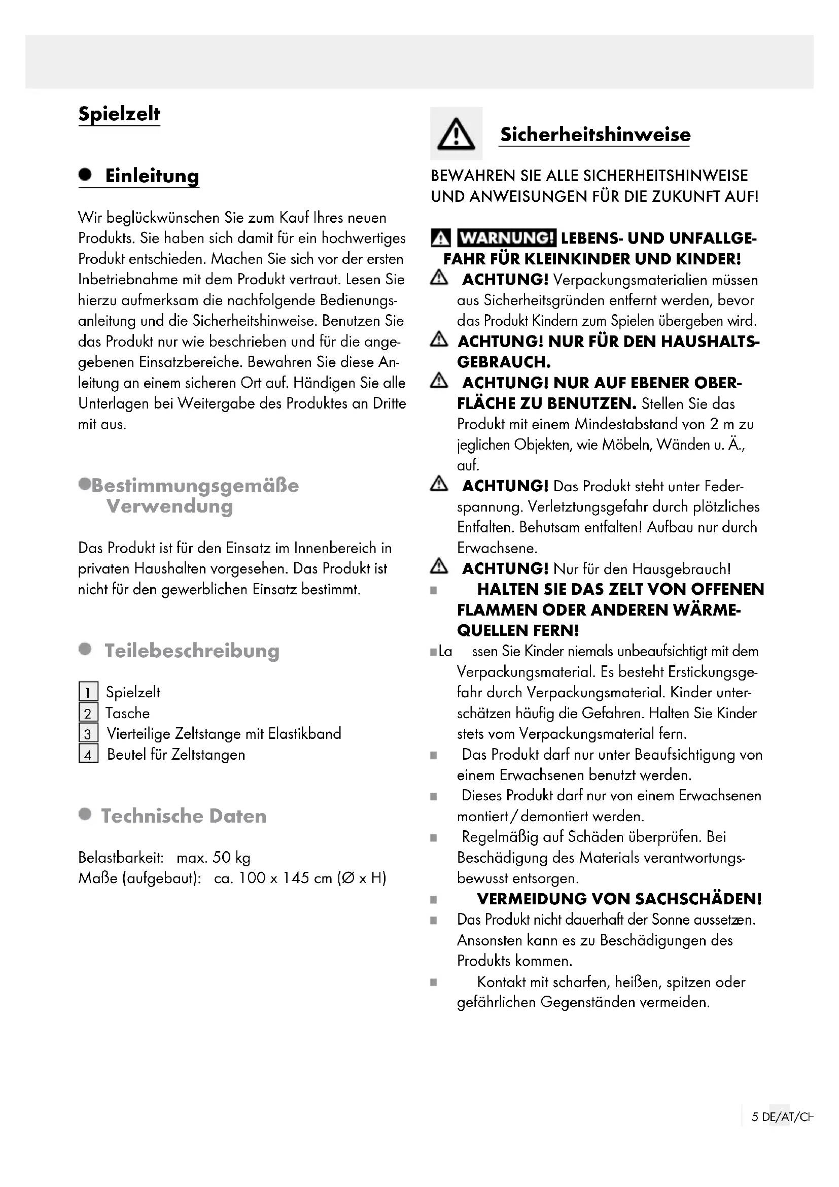 35 DE/AT/CH Spielzelt Einleitung Wir beglückwünschen Sie zum Kauf Ihres neuen Produkts. Sie haben sich damit für ein hochwertiges Produkt entschieden. Machen Sie sich vor der ersten Inbetriebnahme mit dem Produkt vertraut. Lesen Sie hierzu aufmerksam die nachfolgende Bedienungs- anleitung und die Sicherheitshinweise. Benutzen Sie das Produkt nur wie beschrieben und für die ange- gebenen Einsatzbereiche. Bewahren Sie diese An- leitung an einem sicheren Ort auf. Händigen Sie alle Unterlagen bei Weitergabe des Produktes an Dritte mit aus. Bestimmungsgemäße Verwendung Das Produkt ist für den Einsatz im Innenbereich in privaten Haushalten vorgesehen. Das Produkt ist nicht für den gewerblichen Einsatz bestimmt. Teilebeschreibung