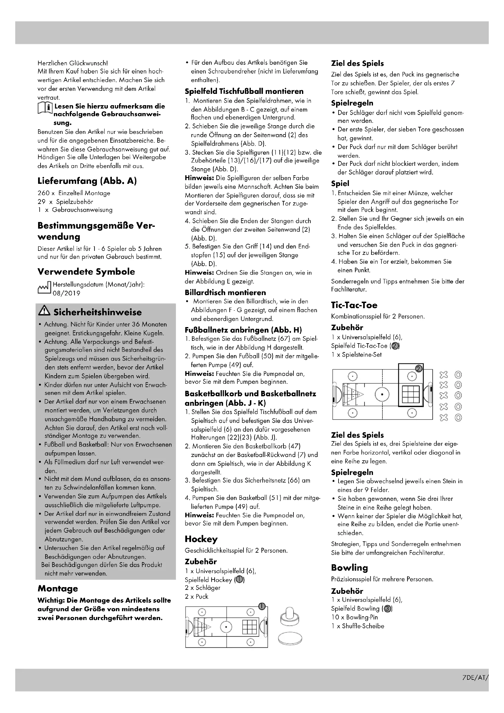 - Gewonnen hat der Spieler, der zuerst alle seine Steine herausgewürfelt hat. Strategien, Tipps und Sonderregeln entnehmen Sie bitte der umfangreichen Fachliteratur. Zubehör und weitere Spiele 1 x Kartendeck 1 x Ringwurfspiel 1 x Hufeisenspiel 2 x Wurfstange mit Saugnapf Lagerung, Reinigung Lagern Sie den Artikel bei Nichtbenutzung immer trocken und sauber bei Raumtemperatur. Nur mit einem trockenen Reinigungstuch sauber wischen. WICHTIG! Nie mit scharfen Reinigungsmitteln reinigen. Hinweise zur Entsorgung Entsorgen Sie den Artikel und die Verpackungs- materialien entsprechend aktueller örtlicher Vorschriften. Verpackungsmaterialien, wie z. B. Folienbeutel, gehören nicht in Kinderhände. Be- wahren Sie das Verpackungsmaterial für Kinder unerreichbar auf. Entsorgen Sie den Artikel und die Verpackung umweltschonend. Der Recycling-Code dient der Kennzeich- nung verschiedener Materialien zur Rückführung in den Wiederverwertungs- kreislauf (Recycling). Der Code besteht aus dem Recyclingsymbol – das den Verwertungskreislauf widerspiegeln soll – und einer Nummer, die das Material kennzeichnet. Hinweise zur Garantie und Serviceabwicklung Der Artikel wurde mit großer Sorgfalt und unter ständiger Kontrolle produziert. Sie erhalten auf diesen Artikel drei Jahre Garantie ab Kaufda- tum. Bitte bewahren Sie den Kassenbon auf. Die Garantie gilt nur für Material- und Fabrikati- onsfehler und entfällt bei missbräuchlicher oder unsachgemäßer Behandlung. Ihre gesetzlichen Rechte, insbesondere die Gewährleistungs- rechte, werden durch diese Garantie nicht eingeschränkt. Bei etwaigen Beanstandungen wenden Sie sich bitte an die unten stehende Service-Hotline oder setzen Sie sich per E-Mail mit uns in Verbindung. Unsere Servicemitarbeiter werden das weitere Vorgehen schnellstmöglich mit Ihnen abstimmen. Wir werden Sie in jedem Fall persönlich beraten. Die Garantiezeit wird durch etwaige Repa- raturen aufgrund der Garantie, gesetzlicher Gewährleistung oder Kulanz nicht verlängert. Dies gilt auch für ersetzte und reparierte Teile. Nach Ablauf der Garantie anfallende Reparatu- ren sind kostenpflichtig. IAN: 322143_1901 Service Deutschland Tel.: 0800-5435111 E-Mail: deltasport@lidl.de Service Österreich Tel.: 0820 201 222 (0,15 EUR/Min.) E-Mail: deltasport@lidl.at Service Schweiz Tel.: 0842 665566 (0,08 CHF/Min., Mobilfunk max. 0,40 CHF/Min.) E-Mail: deltasport@lidl.ch13GB/IE Congratulations! You have chosen to purchase a high-quality pro- duct. Familiarise yourself with the product before using it for the first time. Read the following instructions for use carefully. Use the product only as described and only for the given areas of application. Store these instructions for use carefully. When passing the product on to third parties, please also hand over all accompanying documents. Scope of delivery (fig. A) 260 x Components for assembly 29 x Game accessories 1 x Instructions for use Intended use This product is for 1 - 6 players 5 years of age or older and only intended for private use. Symbols used Date of manufacture (month/year): 08/2019 Safety Information