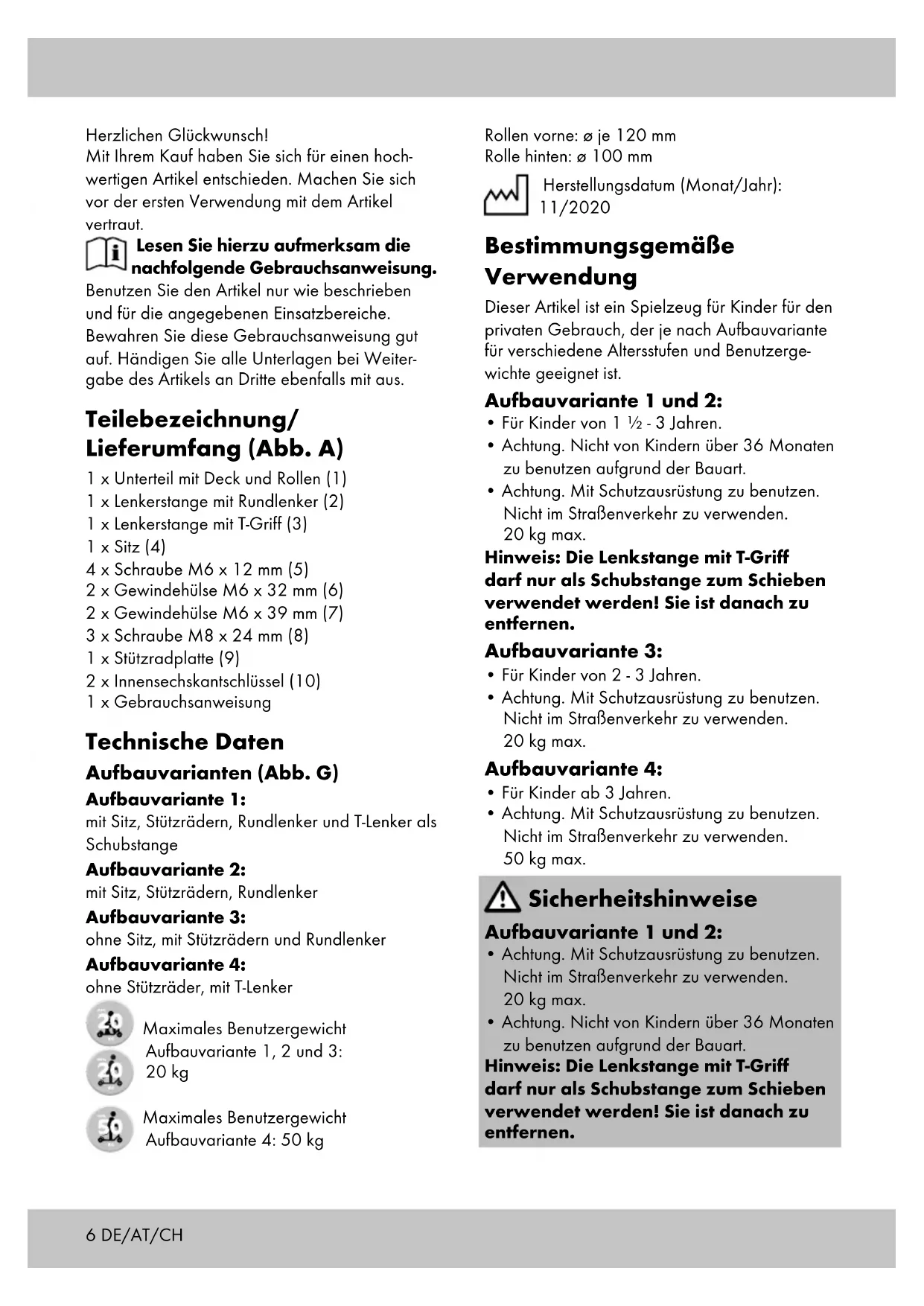 - Achtung. Nicht von Kindern über 36 Monaten zu benutzen aufgrund der Bauart. Hinweis: Die Lenkstange mit T-Griff darf nur als Schubstange zum Schieben verwendet werden! Sie ist danach zu entfernen.7DE/AT/CH Aufbauvariante 3: