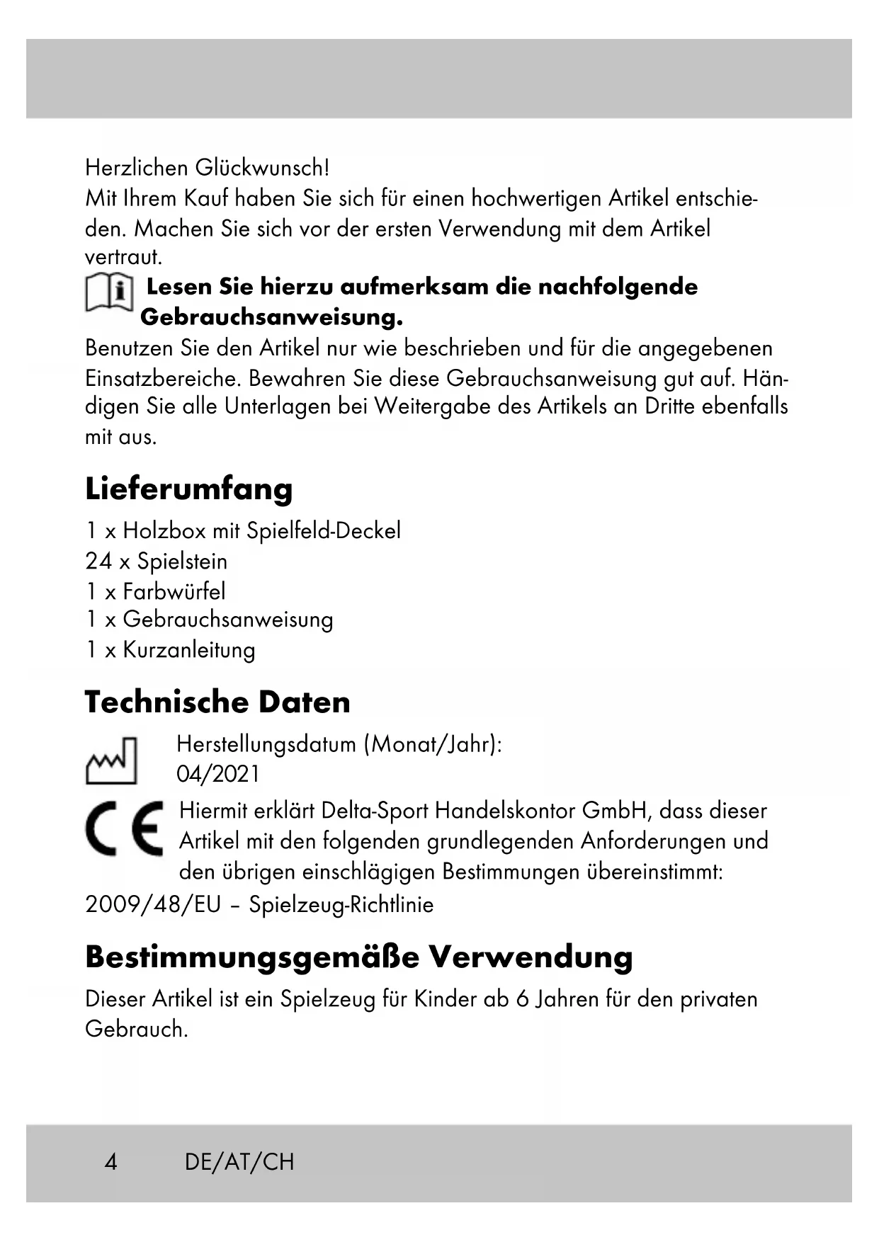 - - 40 Brugervejledning - 444 Herzlichen Glückwunsch! Mit Ihrem Kauf haben Sie sich für einen hochwertigen Artikel entschie- den. Machen Sie sich vor der ersten Verwendung mit dem Artikel vertraut. Lesen Sie hierzu aufmerksam die nachfolgende Gebrauchsanweisung. Benutzen Sie den Artikel nur wie beschrieben und für die angegebenen Einsatzbereiche. Bewahren Sie diese Gebrauchsanweisung gut auf. Hän- digen Sie alle Unterlagen bei Weitergabe des Artikels an Dritte ebenfalls mit aus. Lieferumfang 1 x Holzbox mit Spielfeld-Deckel 24 x Spielstein 1 x Farbwürfel 1 x Gebrauchsanweisung 1 x Kurzanleitung Technische Daten Herstellungsdatum (Monat/Jahr): 04/2021 Hiermit erklärt Delta-Sport Handelskontor GmbH, dass dieser Artikel mit den folgenden grundlegenden Anforderungen und den übrigen einschlägigen Bestimmungen übereinstimmt: 2009/48/EU – Spielzeug-Richtlinie Bestimmungsgemäße Verwendung Dieser Artikel ist ein Spielzeug für Kinder ab 6 Jahren für den privaten Gebrauch. DE/AT/CH5 Sicherheitshinweise p. 41