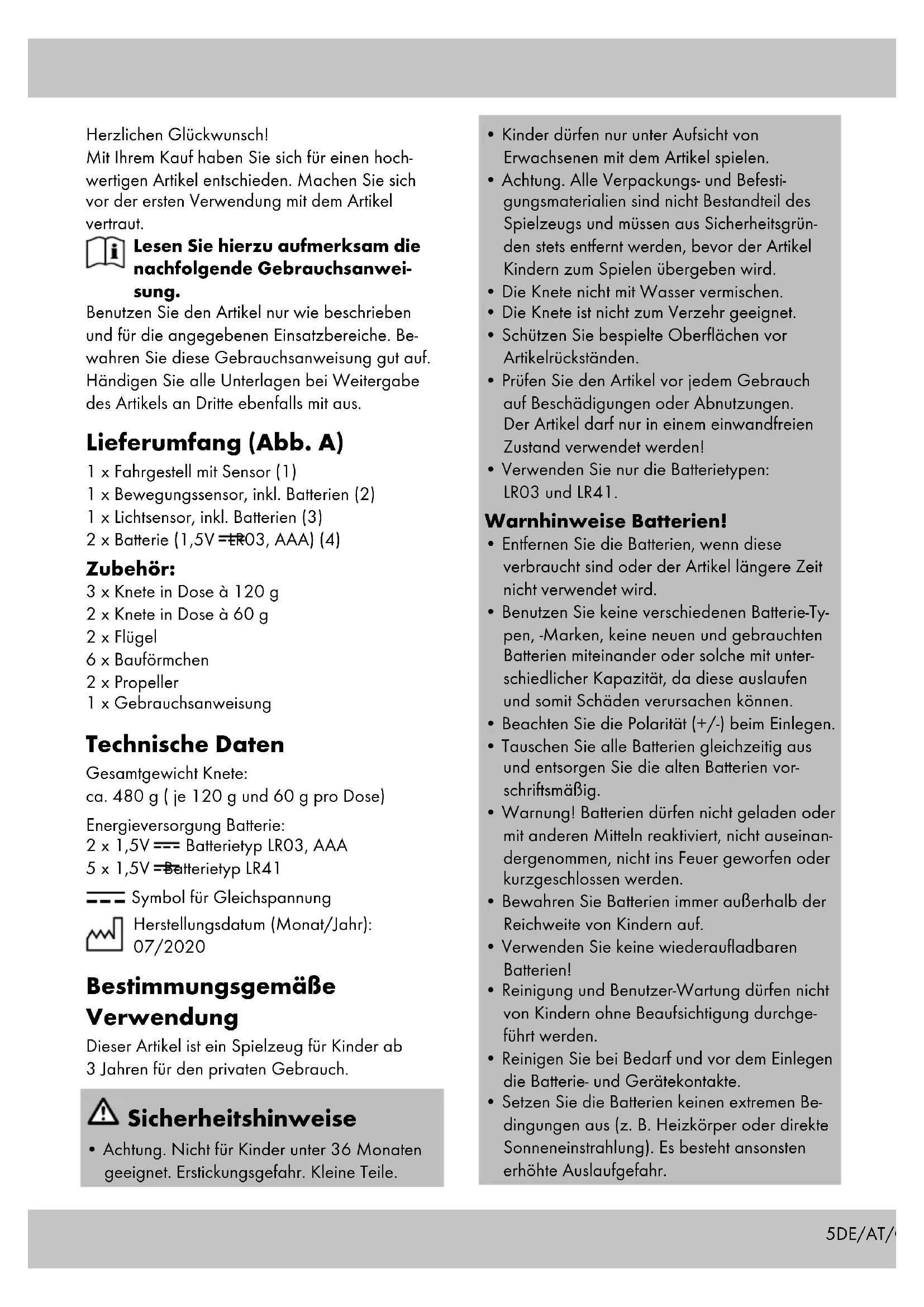 D5DE/AT/CH Herzlichen Glückwunsch! Mit Ihrem Kauf haben Sie sich für einen hoch- wertigen Artikel entschieden. Machen Sie sich vor der ersten Verwendung mit dem Artikel vertraut. Lesen Sie hierzu aufmerksam die nachfolgende Gebrauchsanwei- sung. Benutzen Sie den Artikel nur wie beschrieben und für die angegebenen Einsatzbereiche. Be- wahren Sie diese Gebrauchsanweisung gut auf. Händigen Sie alle Unterlagen bei Weitergabe des Artikels an Dritte ebenfalls mit aus. Lieferumfang (Abb. A) 1 x Fahrgestell mit Sensor (1) 1 x Bewegungssensor, inkl. Batterien (2) 1 x Lichtsensor, inkl. Batterien (3) 2 x Batterie (1,5V LR03, AAA) (4) Zubehör: 3 x Knete in Dose à 120 g 2 x Knete in Dose à 60 g 2 x Flügel 6 x Bauförmchen 2 x Propeller 1 x Gebrauchsanweisung Technische Daten Gesamtgewicht Knete: ca. 480 g ( je 120 g und 60 g pro Dose) Energieversorgung Batterie: 2 x 1,5V Batterietyp LR03, AAA 5 x 1,5V Batterietyp LR41 Symbol für Gleichspannung Herstellungsdatum (Monat/Jahr): 07/2020 Bestimmungsgemäße Verwendung Dieser Artikel ist ein Spielzeug für Kinder ab 3 Jahren für den privaten Gebrauch. Sicherheitshinweise