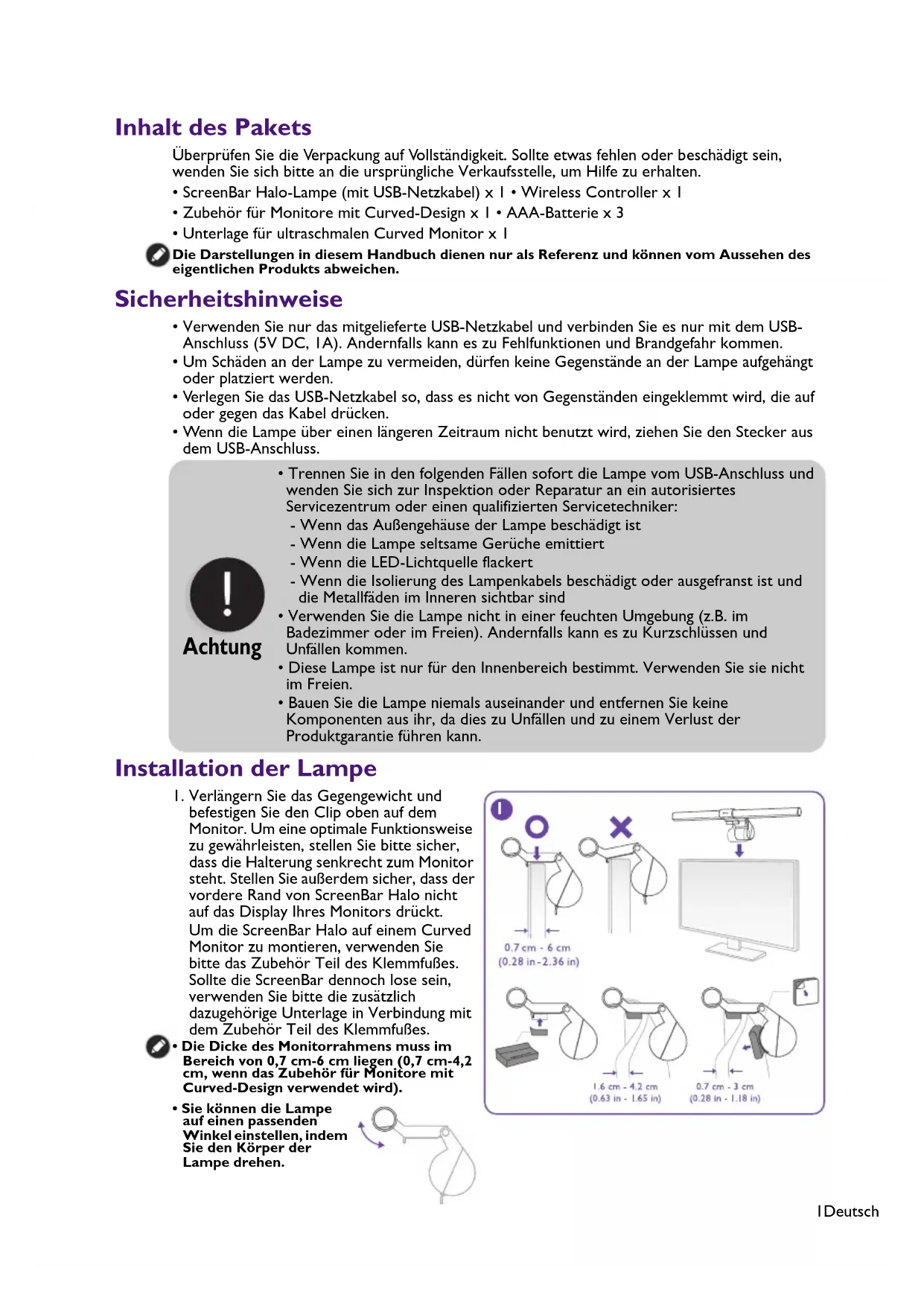 Inhalt des Pakets Überprüfen Sie die Verpackung auf Vollständigkeit. Sollte etwas fehlen oder beschädigt sein, wenden Sie sich bitte an die ursprüngliche Verkaufsstelle, um Hilfe zu erhalten. Die Darstellungen in diesem Handbuch dienen nur als Referenz und können vom Aussehen des eigentlichen Produkts abweichen. Sicherheitshinweise