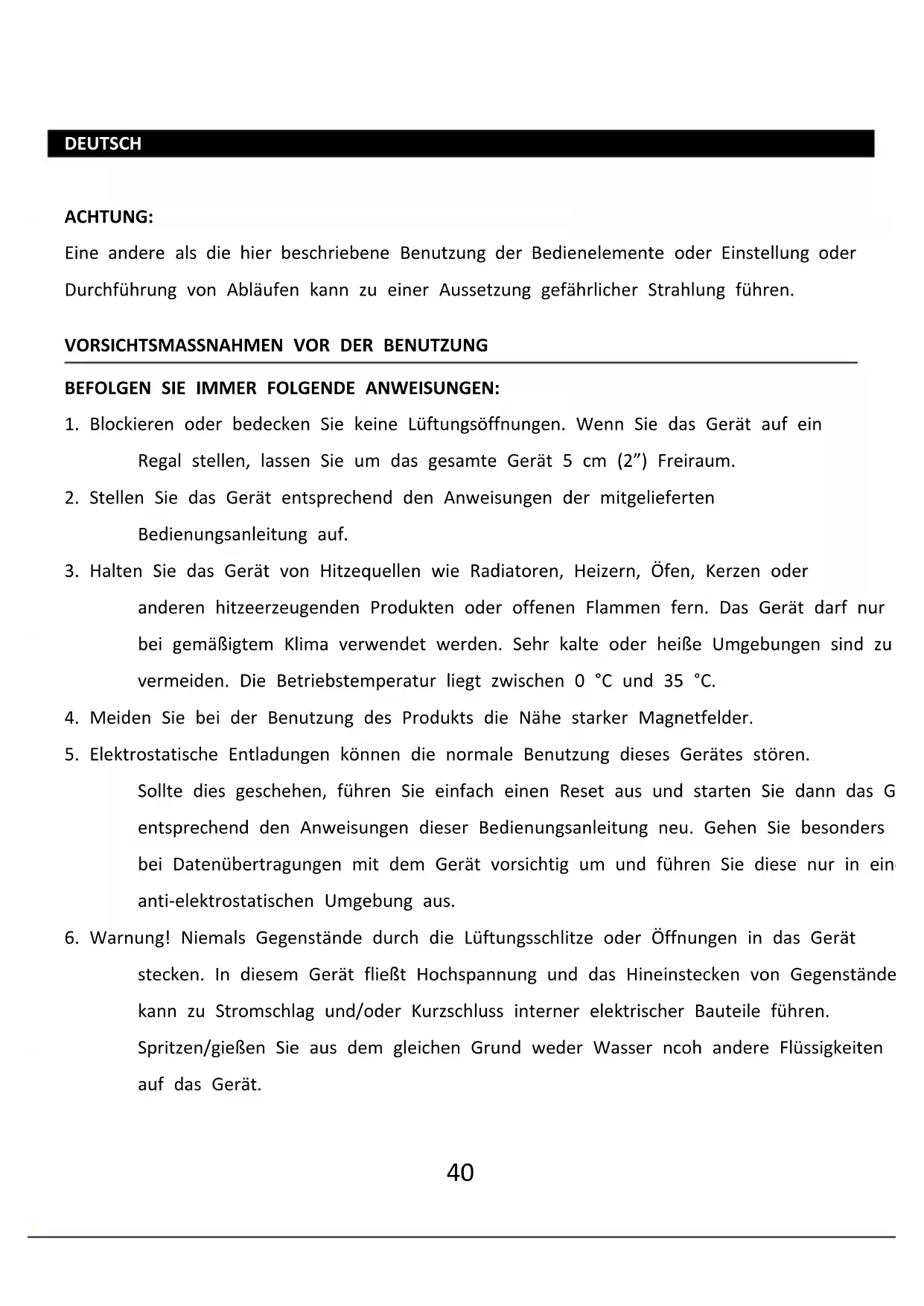 Service Bezoek voor meer informatie en helpdeskondersteuningwww.lenco.com Commaxx B.V. Wiebachstraat 37, 6466NG Kerkrade, The Netherlands40 DEUTSCH ACHTUNG: Eine andere als die hier beschriebene Benutzung der Bedienelemente oder Einstellung oder Durchführung von Abläufen kann zu einer Aussetzung gefährlicher Strahlung führen.