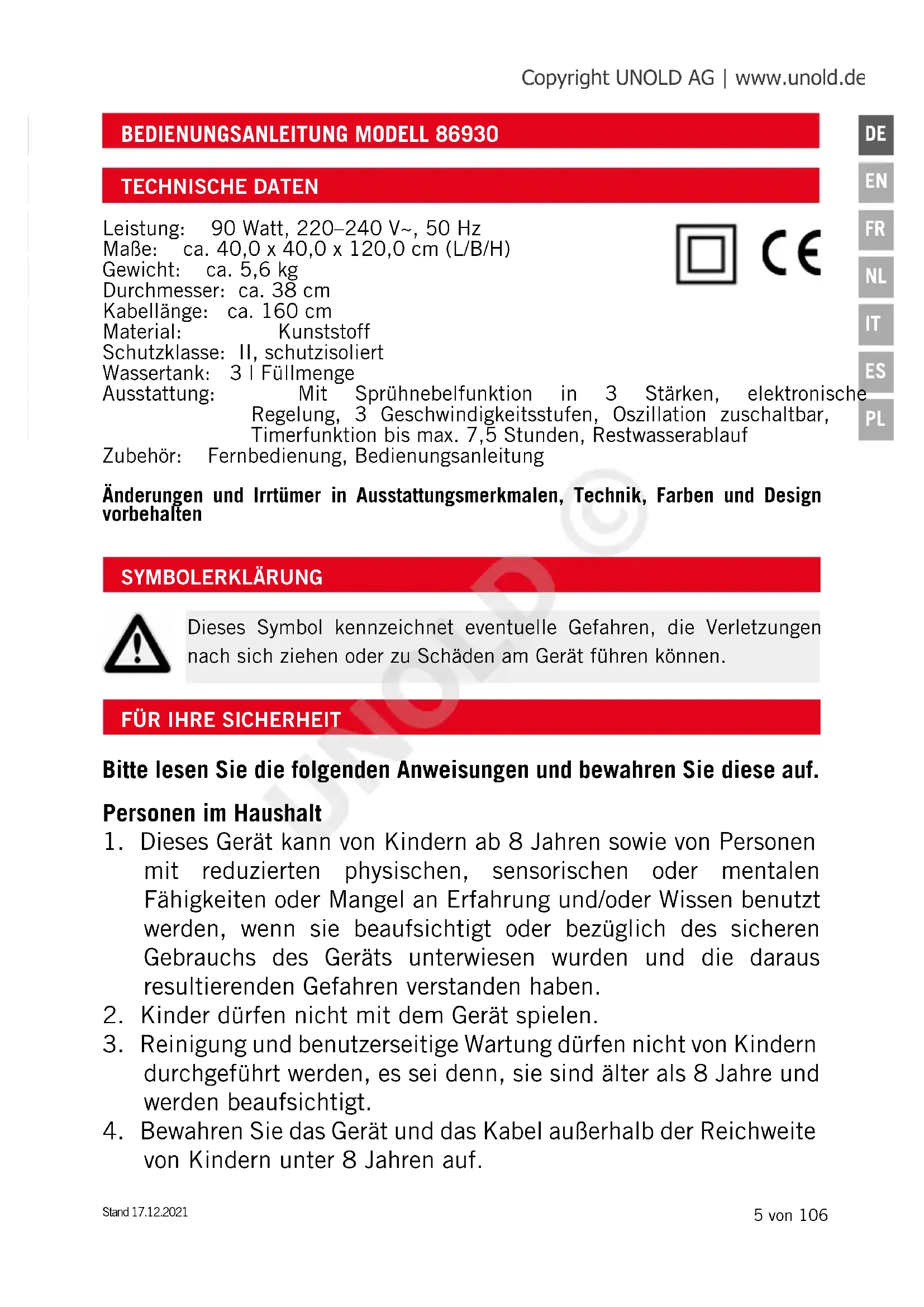 Hiermit erklärt die UNOLD AG, dass sich der Ventilator 86930 in Übereinstimmung mit den grundlegenden Anforderungen der europäischen Richtlinie für elektromagnetische Verträglichkeit (2014/30/EU) und der Niederspannungsrichtlinie (2014/35/EC) bendet. Die Übereinstimmung mit den Regularien bezieht sich auf den Tag der Erstellung dieser Erklärung. Hockenheim, 8.11.2018, UNOLD AG, Mannheimer Straße 4, 68766 Hockenheim GARANTIEBESTIMMUNGEN ENTSORGUNG / UMWELTSCHUTZ Unsere Geräte werden auf hohem Qualitätsniveau für eine lange Nutzungsdauer her- gestellt. Regelmäßige Wartung und fachgerechte Reparaturen durch unseren Kunden- dienst können die Nutzungsdauer des Gerätes verlängern. Wenn ein Gerät defekt und nicht mehr zu reparieren ist, beachten Sie bitte: Dieses Produkt darf nicht zusammen mit dem normalen Hausmüll entsorgt werden. Sie müssen dieses Produkt an einer aus- gewiesenen Sammelstelle zum Recycling von elektrischen oder elektronischen Geräten abliefern. Durch das separate Sammeln und Recyceln von Abfallprodukten helfen Sie mit, die natürlichen Ressourcen zu schonen und stellen sicher, dass das Produkt in gesundheits- und umweltverträglicher Weise entsorgt wird. Wir gewähren auf unsere Geräte eine Garantie von 24 Monaten, bei gewerblichem Gebrauch 12 Monate, ab dem Kaufdatum für Schäden, die bei bestimmungsgemäßem Gebrauch nachweislich auf Werksfehler zurückzuführen sind. Innerhalb der Garantiezeit beheben wir Material- und Herstel- lungsfehler nach unserem Ermessen durch Reparatur oder Umtausch. Unsere Garantieleistungen gelten ausschließlich für in Deutschland und Österreich verkaufte Geräte. Bei anderen Ländern wenden Sie sich bitte an den zuständigen Importeur. Geräte, für die eine Mängelbeseitigung bean- sprucht wird, senden Sie bitte zusammen mit einer Kopie des maschinell erstellten Kaufbelegs, aus dem das Kaufdatum ersichtlich sein muss, sowie einer Fehlerbeschreibung gut verpackt an unseren Kundendienst. Auf unserer Internetseite www.unold.de/ruecksendung können Sie sich einen Rück- sendeschein ausdrucken. (nur für Einsendungen aus Deutschland und Österreich). Von der Garantie ausgeschlossen sind Schäden durch Verschleiß, unsachgemäße Handhabung und Nichteinhaltung der Wartungs- und Pflegeanweisungen. Der Garantieanspruch erlischt, wenn Reparaturen oder Ein- griffe am Gerät von dritter Stelle vorgenommen werden. Eventuelle Ansprüche des Endverbrauchers gegenüber dem Verkäufer oder Händler werden durch diese Garantie nicht eingeschränkt. Verbrauchte Batterien gehören nicht in den Hausmüll. Bitte entsorgen Sie diese über Ihren Elektrohändler oder die jeweilige kommunale Sammelstelle.. Copyright UNOLD AG | www.unold.de UNOLD ©Diese Anleitung kann im Internet unter www.unold.de als pdf-Datei heruntergeladen werden. SERVICE-ADRESSEN DEUTSCHLAND SCHWEIZ POLEN Mannheimer Straße 4 68766 Hockenheim Kundendienst Telefon +49 (0) 62 05/94 18-27 Telefax +49 (0) 62 05/94 18-22 E-Mail service@unold.de Internet www.unold.de Sie möchten innerhalb der Garantiezeit ein Gerät zur Reparatur einsenden? Auf unserer Internetseite www.unold.de/ruecksendung können Sie sich einen Rücksendeschein ausdrucken, um damit das Paket kostenlos bei der Post abzugeben (nur für Einsendungen aus Deutschland und Österreich). MENAGROS AG Hauptstr. 23 CH 9517 Mettlen Telefon +41 (0) 71 6346015 Telefax +41 (0) 71 6346011 E-Mail info@bamix.ch Internet www.bamix.ch Quadra-Net Dziadoszanska 10 61-248 Poznań Internet www.quadra-net.pl Stand 17.12.2021 19 von 106