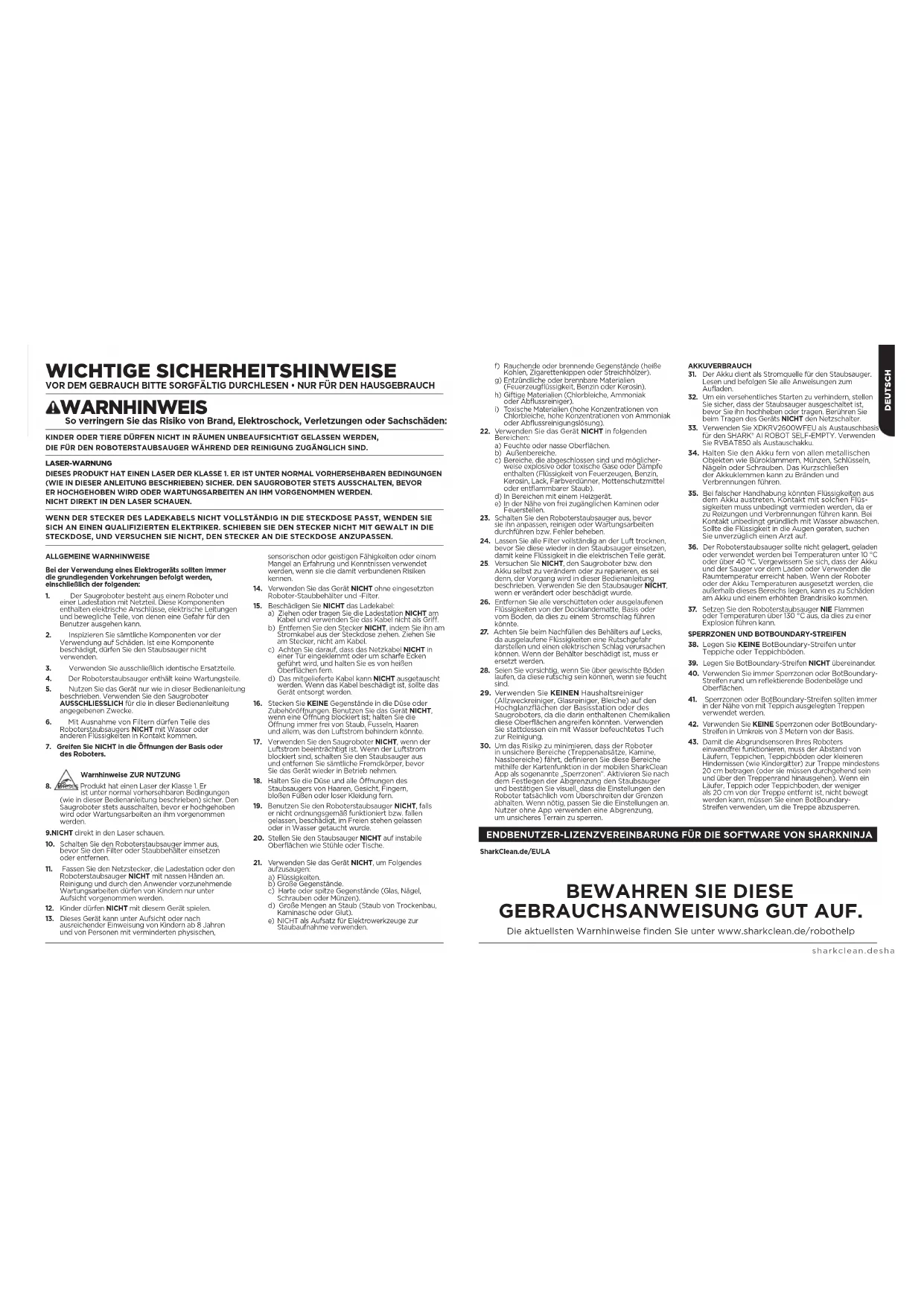 einwandfrei funktionieren, muss der Abstand von Läufern, Teppichen, Teppichböden oder kleineren Hindernissen (wie Kindergitter) zur Treppe mindestens 20cm betragen (oder sie müssen durchgehend sein und über den Treppenrand hinausgehen). Wenn ein Läufer, Teppich oder Teppichboden, der weniger als 20cm von der Treppe entfernt ist, nicht bewegt werden kann, müssen Sie einen BotBoundary- Streifen verwenden, um die Treppe abzusperren. KINDER ODER TIERE DÜRFEN NICHT IN RÄUMEN UNBEAUFSICHTIGT GELASSEN WERDEN, DIE FÜR DEN ROBOTERSTAUBSAUGER WÄHREND DER REINIGUNG ZUGÄNGLICH SIND. LASER-WARNUNG DIESES PRODUKT HAT EINEN LASER DER KLASSE1. ER IST UNTER NORMAL VORHERSEHBAREN BEDINGUNGEN (WIE IN DIESER ANLEITUNG BESCHRIEBEN) SICHER. DEN SAUGROBOTER STETS AUSSCHALTEN, BEVOR ER HOCHGEHOBEN WIRD ODER WARTUNGSARBEITEN AN IHM VORGENOMMEN WERDEN. NICHT DIREKT IN DEN LASER SCHAUEN.
