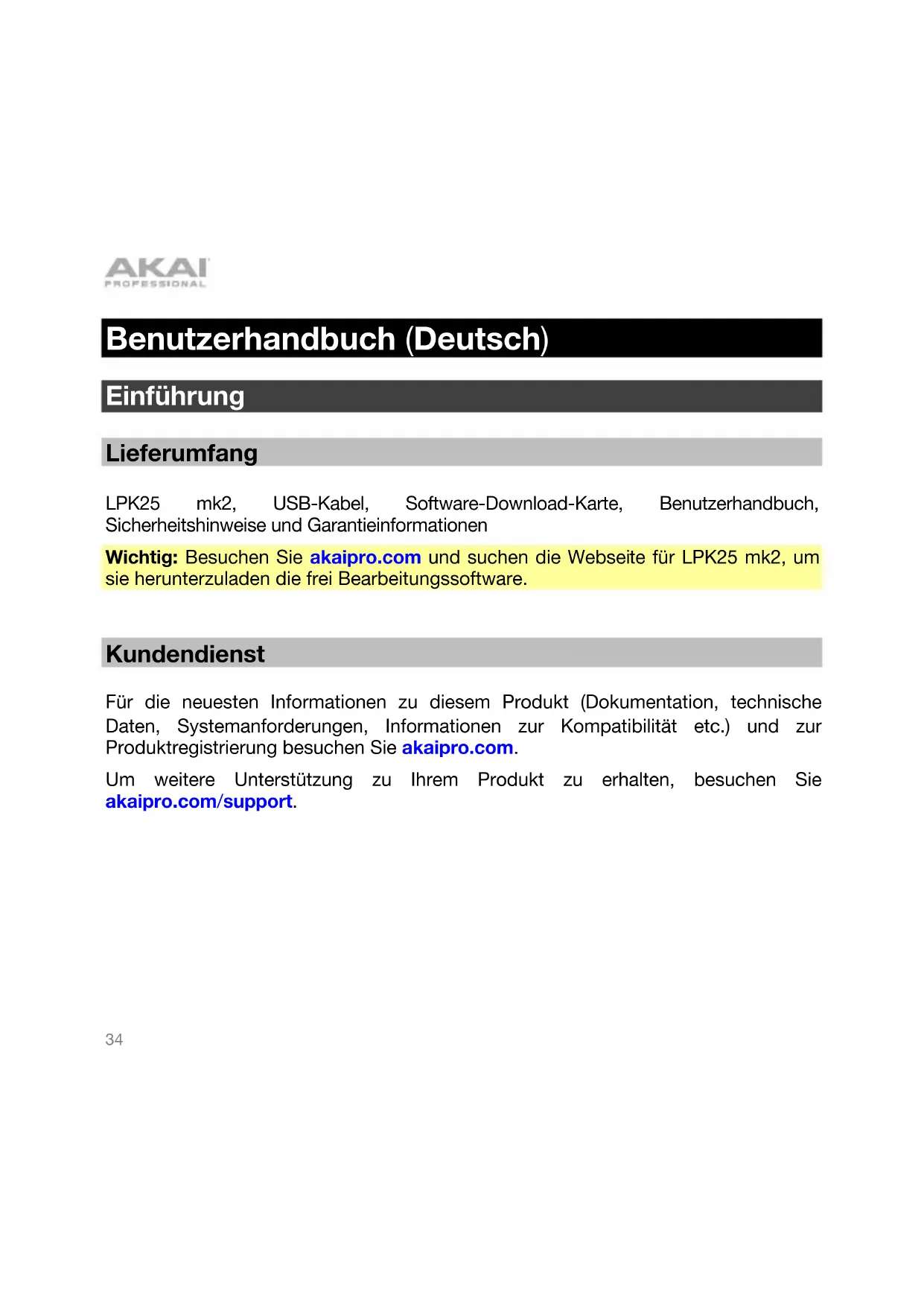 Kundendienst Für die neuesten Informationen zu diesem Produkt (Dokumentation, technische Daten, Systemanforderungen, Informationen zur Kompatibilität etc.) und zur Produktregistrierung besuchen Sie akaipro.com. Um weitere Unterstützung zu Ihrem Produkt zu erhalten, besuchen Sie akaipro.com/support.35 Schnelles Einrichten Anschlussdiagramm Teile, die nicht unter Einführung > Lieferumfang angegeben sind, sind separat erhältlich.