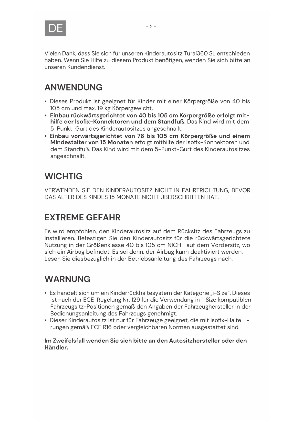 Vielen Dank, dass Sie sich für unseren Kinderautositz Turai360 SL entschieden haben. Wenn Sie Hilfe zu diesem Produkt benötigen, wenden Sie sich bitte an unseren Kundendienst. ANWENDUNG