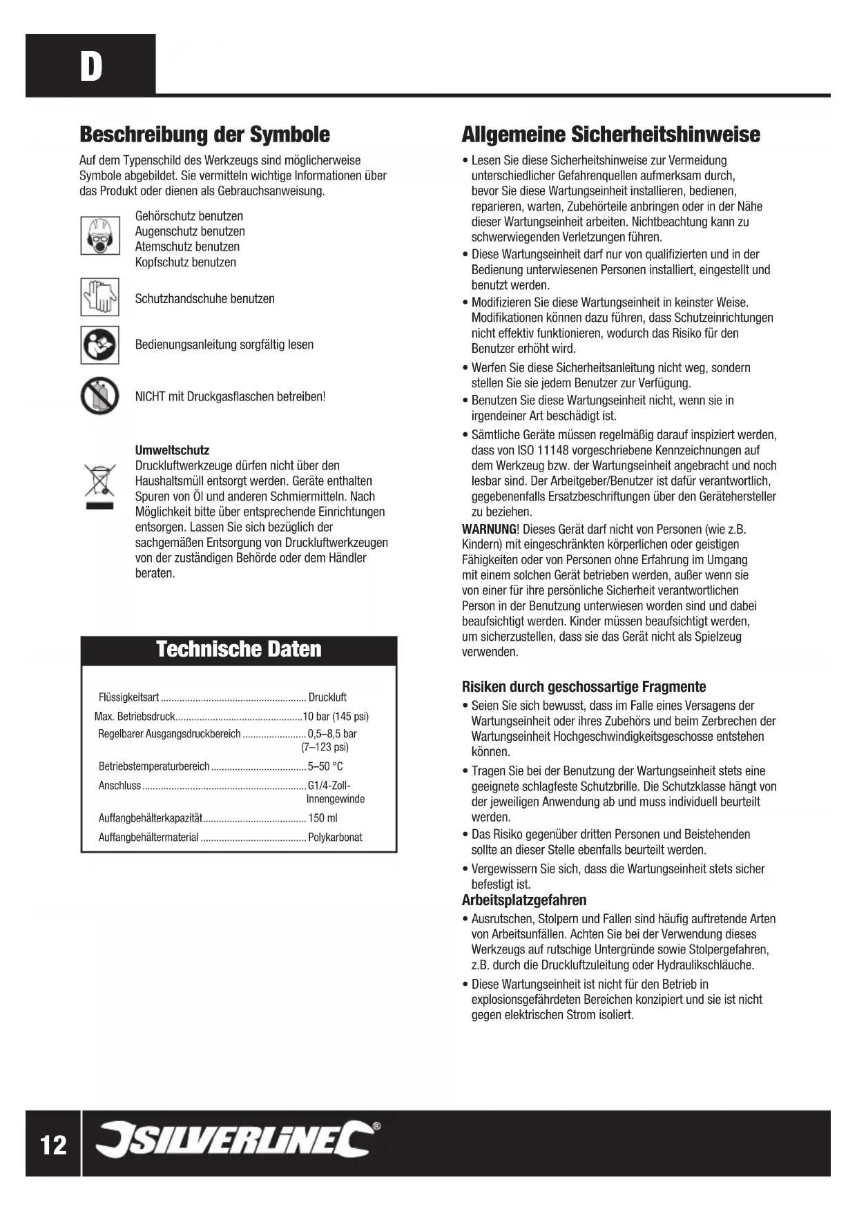 Bedienungsanleitung sorgfältig lesen NICHT mit Druckgasflaschen betreiben! Umweltschutz Druckluftwerkzeuge dürfen nicht über den Haushaltsmüll entsorgt werden. Geräte enthalten Spuren von Öl und anderen Schmiermitteln. Nach Möglichkeit bitte über entsprechende Einrichtungen entsorgen. Lassen Sie sich bezüglich der sachgemäßen Entsorgung von Druckluftwerkzeugen von der zuständigen Behörde oder dem Händler beraten. Technische Daten Flüssigkeitsart ....................................................... Druckluft Max. Betriebsdruck ................................................10 bar (145 psi) Regelbarer Ausgangsdruckbereich ........................ 0,5–8,5 bar (7–123 psi) Betriebstemperaturbereich .................................... 5–50 °C Anschluss .............................................................. G1/4-Zoll- Innengewinde Auffangbehälterkapazität ....................................... 150 ml Auffangbehältermaterial ........................................ Polykarbonat 427596_Z1MANPRO2.indd 12 07/01/2014 16:10www.silverlinetools.com