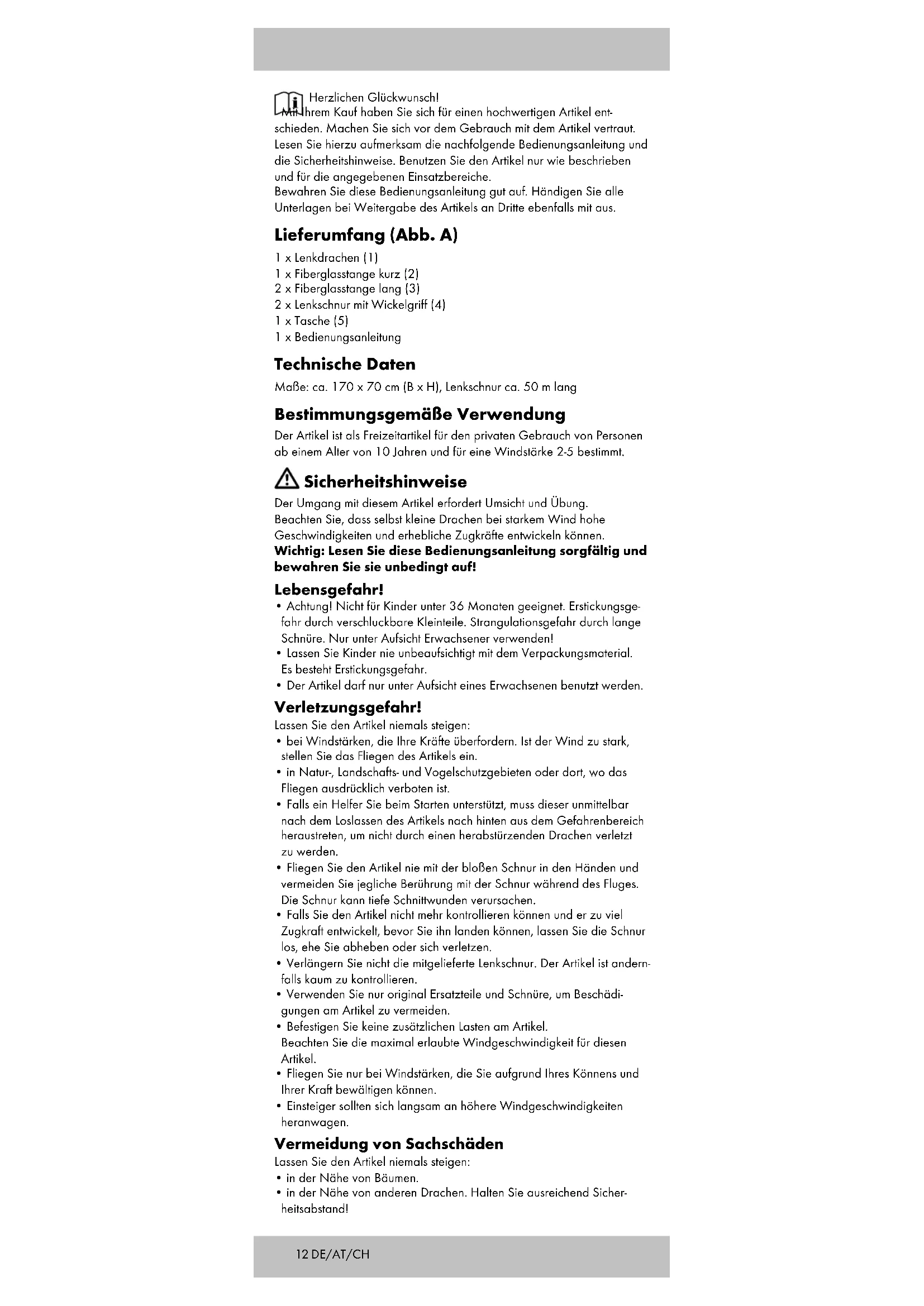- in der Nähe von anderen Drachen. Halten Sie ausreichend Sicher- heitsabstand!13DE/AT/CH Warnung: Lebensgefahr! Lassen Sie den Artikel niemals steigen: