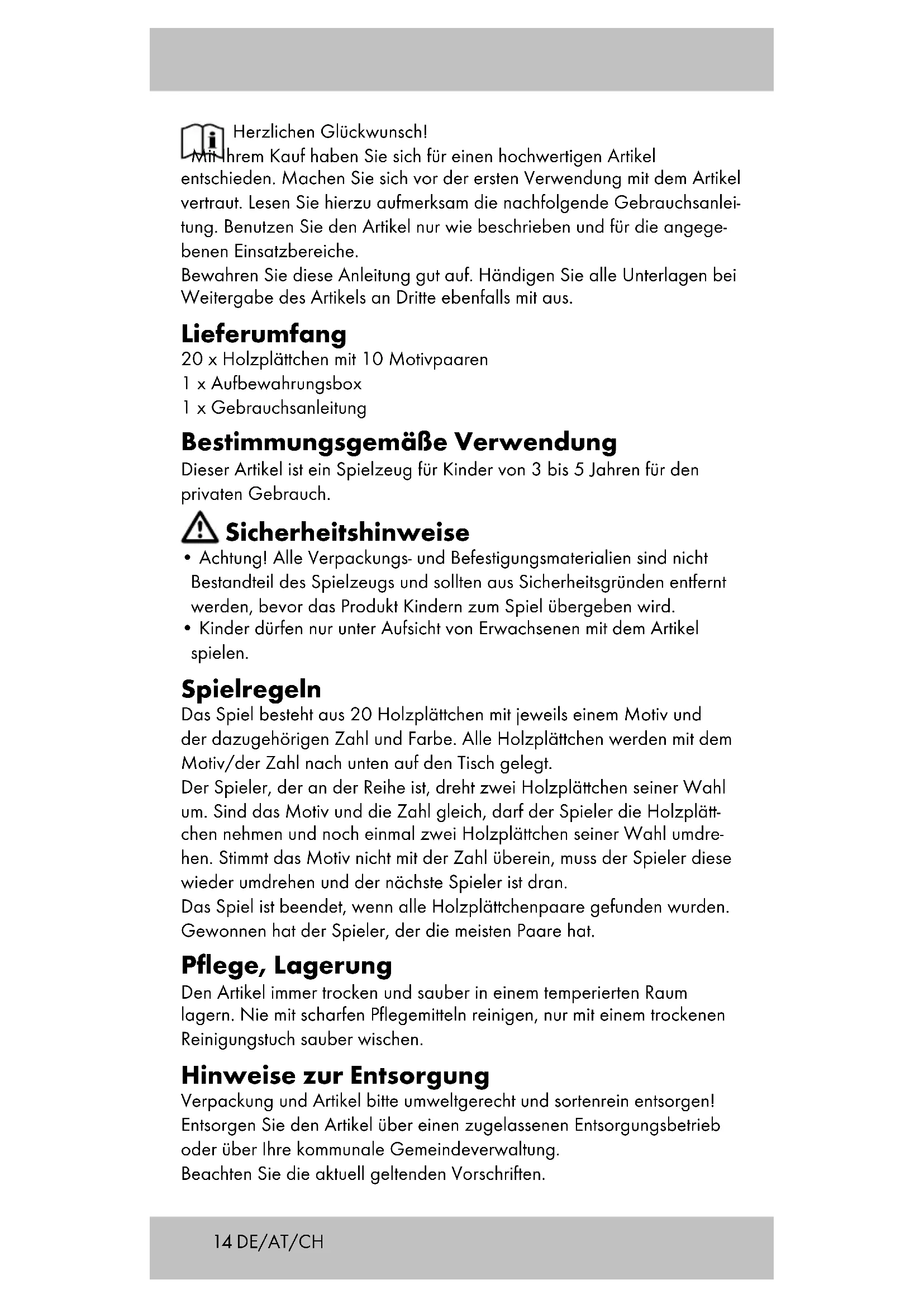 - Kinder dürfen nur unter Aufsicht von Erwachsenen mit dem Artikel spielen. Spielregeln Das Spiel besteht aus 20 Holzplättchen mit jeweils einem Motiv und der dazugehörigen Zahl und Farbe. Alle Holzplättchen werden mit dem Motiv/der Zahl nach unten auf den Tisch gelegt. Der Spieler, der an der Reihe ist, dreht zwei Holzplättchen seiner Wahl um. Sind das Motiv und die Zahl gleich, darf der Spieler die Holzplätt- chen nehmen und noch einmal zwei Holzplättchen seiner Wahl umdre- hen. Stimmt das Motiv nicht mit der Zahl überein, muss der Spieler diese wieder umdrehen und der nächste Spieler ist dran. Das Spiel ist beendet, wenn alle Holzplättchenpaare gefunden wurden. Gewonnen hat der Spieler, der die meisten Paare hat. Pflege, Lagerung Den Artikel immer trocken und sauber in einem temperierten Raum lagern. Nie mit scharfen Pflegemitteln reinigen, nur mit einem trockenen Reinigungstuch sauber wischen. Hinweise zur Entsorgung Verpackung und Artikel bitte umweltgerecht und sortenrein entsorgen! Entsorgen Sie den Artikel über einen zugelassenen Entsorgungsbetrieb oder über Ihre kommunale Gemeindeverwaltung. Beachten Sie die aktuell geltenden Vorschriften.15DE/AT/CH 3 Jahre garantie Das Produkt wurde mit großer Sorgfalt und unter ständiger Kontrolle produziert. Sie erhalten auf dieses Produkt drei Jahre Garantie ab Kauf- datum. Bitte bewahren Sie den Kassenbon auf. Die Garantie gilt nur für Material- und Fabrikationsfehler und entfällt bei missbräuchlicher oder unsachgemäßer Behandlung. Ihre gesetzlichen Rechte, insbesondere die Gewährleistungsrechte, werden durch diese Garantie nicht eingeschränkt. Bei etwaigen Beanstandungen wenden Sie sich bitte an die unten stehen- de Service-Hotline oder setzen Sie sich per E-Mail mit uns in Verbindung. Unsere Servicemitarbeiter werden das weitere Vorgehen schnellstmöglich mit Ihnen abstimmen. Wir werden Sie in jedem Fall persönlich beraten. Die Garantiezeit wird durch etwaige Reparaturen aufgrund der Garantie, gesetzlicher Gewährleistung oder Kulanz nicht verlängert. Dies gilt auch für ersetzte und reparierte Teile. Nach Ablauf der Garantie anfallende Reparaturen sind kostenpflichtig. IAN: 110192 Service Deutschland Tel.: 0800-5435111 E-Mail: deltasport@lidl.de Service Österreich Tel.: 0820 201 222 (0,15 EUR/Min.) E-Mail: deltasport@lidl.at Service Schweiz Tel.: 0842 665566 (0,08 CHF/Min., Mobilfunk max. 0,40 CHF/Min.) E-Mail: deltasport@lidl.ch Sie können alle Artikel auch direkt in unserem Online-Shop bestellen: www.delta-sport.infoDELTA-SPORT HANDELSKONTOR GMBH Wragekamp 6 D-22397 Hamburg Version: 07/2015 Delta-Sport-Nr.: BM-2140 IAN 110192
