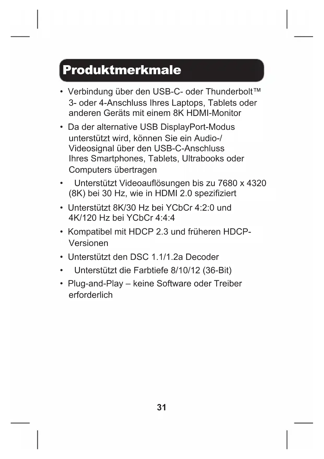 Monitor. Passen Sie die Videoanzeige mit den Anzeigeeinstellungen Ihres Geräts an. Installation34 Technische Daten Steckverbinder Eingang USB Type-C (Stecker) Ausgang HDMI (Buchse) Video MaximaleAuösung 7680x4320bei 30 Hz (8K) HDCP 2.3 Farbtiefe 8/10/12-Bit(36-Bit) Pixelformat RGB/YCbCr 4:4:4, YCbCr 4:2:2, YCbCr 4:2:0 DSC DSC 1.1/1.2a HDR HDR10+ Umgebungsinformationen Betriebstemperaturbereich 0 °C bis 45 °C Lagertemperaturbereich -10°Cbis70°C Relative Feuchtigkeit (Bereich) 10 % bis 90 % rF Stromversorgung Busbetrieben Physische Kabellänge 110 mm Abmessungen der Einheit [HxBxT] 15,5x37x41,85mm35