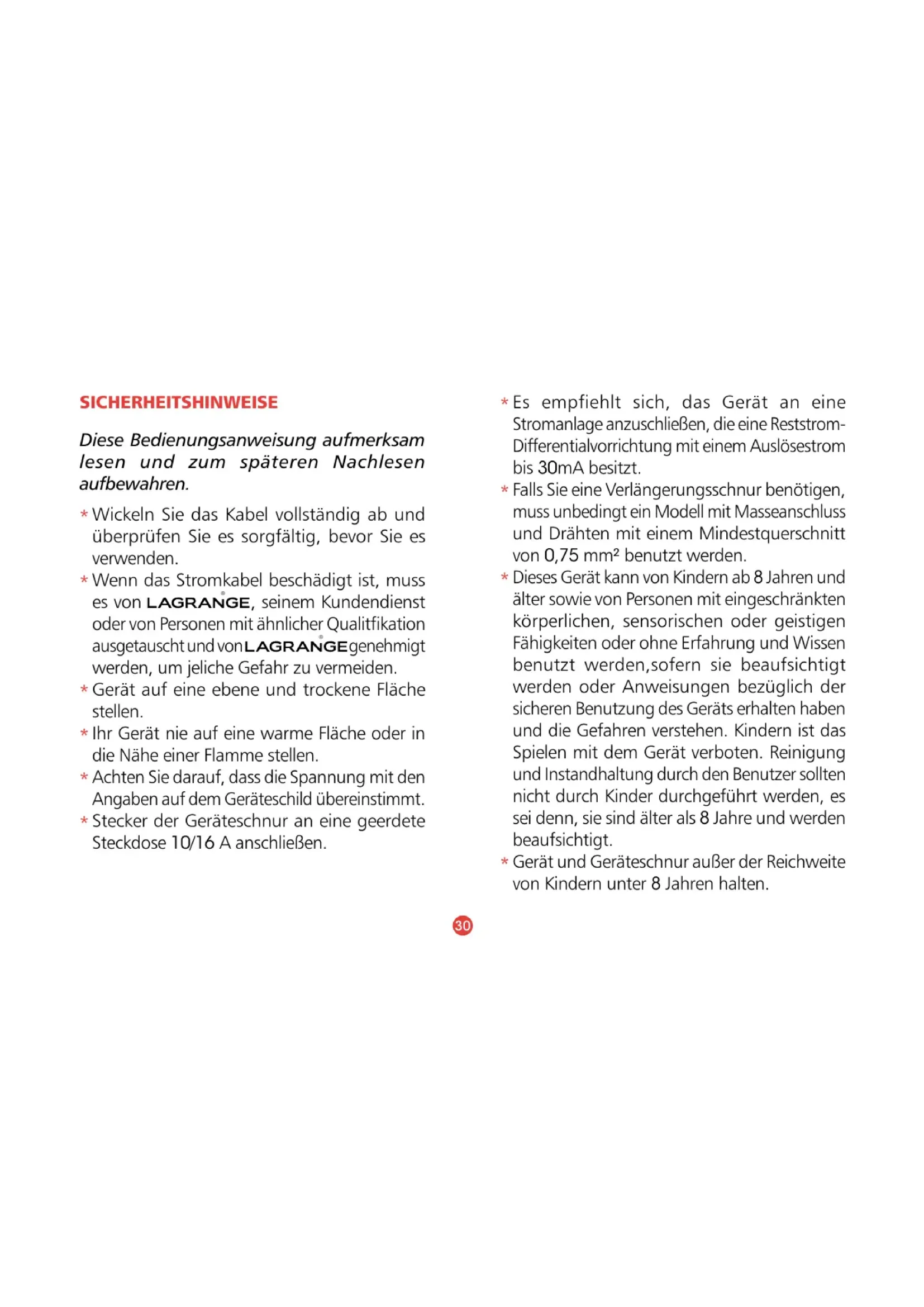 DEUALLGEMEINE GARANTIEBEDINGUNGEN Garantien für elektrische Haushaltsgeräte von . Für das Gerät gilt eine Garantie von von zwei Jahren. Ein zusätzliches Jahr Garantie erhalten Sie kostenlos, wenn Sie sich auf der Internetseite (www.lagrange.fr) registrieren. Die Garantie umfasst Ersatzteile und Arbeitskosten und deckt alle Fertigungsmängel ab. Ausgeschlossen von der Garantie sind Beschädigungen in Folge einer unsachgemäßen Verwendung oder Nichtbeachtung der Bedienungsanleitung sowie Sturzbes chädigungen. DIESE GARANTIE GILT NUR BEI PRIVATEM GEBRAUCH. SIE GILT IN