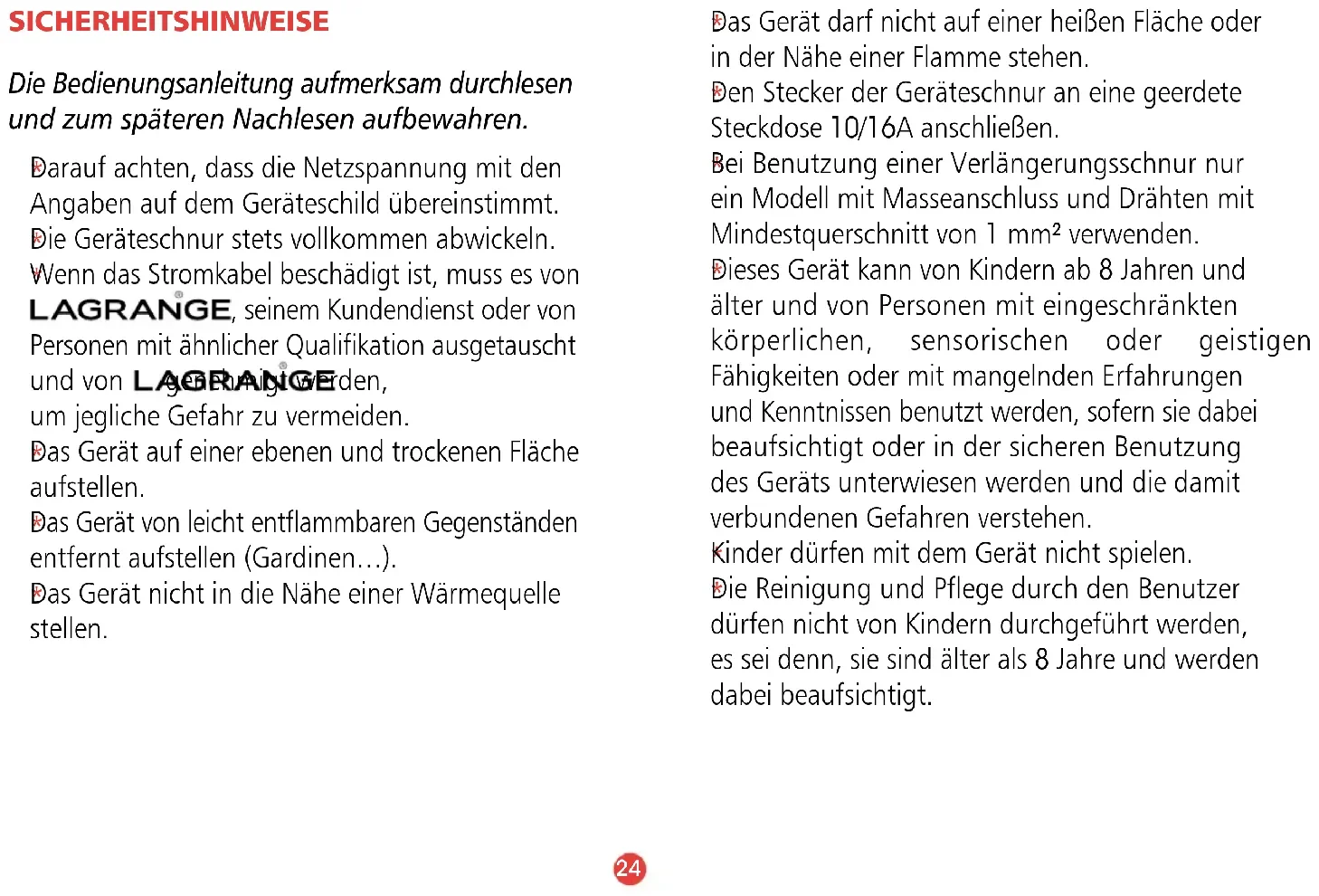 Darauf achten, dass die Netzspannung mit den Angaben auf dem Geräteschild übereinstimmt. Die Geräteschnur stets vollkommen abwickeln. Wenn das Stromkabel beschädigt ist, muss es von LAGRANGE, seinem Kundendienst oder von Personen mit ähnlicher Qualifikation ausgetaucht und von LAGRANGE den, um jegliche Gefahr zu vermeiden.