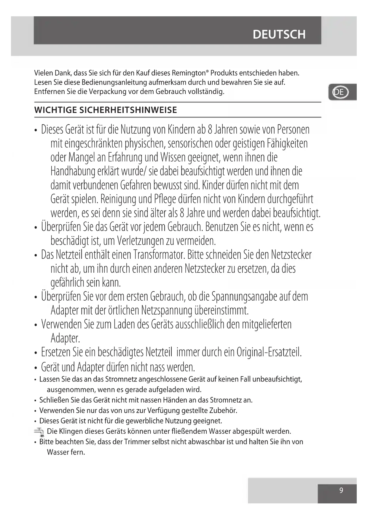 Vielen Dank, dass Sie sich für den Kauf diesen Remington® Produkts entschieden haben. Lesen Sie diese Bedienungsanleitung aufmerksam durch und bewahren Sie sie auf. Entfernen Sie die Verpackung vor dem Gebrauch vollständig.