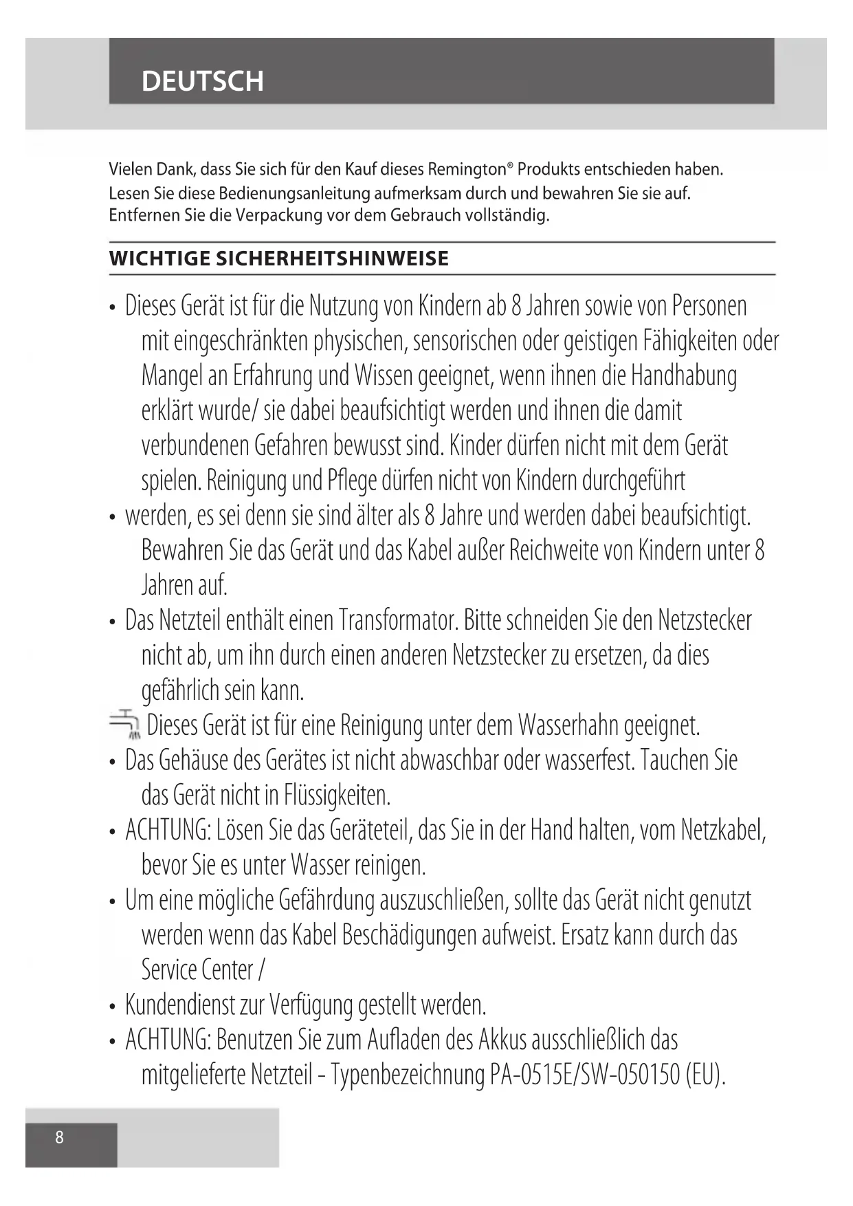 AE8 Vielen Dank, dass Sie sich für den Kauf dieses Remington® Produkts entschieden haben. Lesen Sie diese Bedienungsanleitung aufmerksam durch und bewahren Sie sie auf. Entfernen Sie die Verpackung vor dem Gebrauch vollständig. WICHTIGE SICHERHEITSHINWEISE