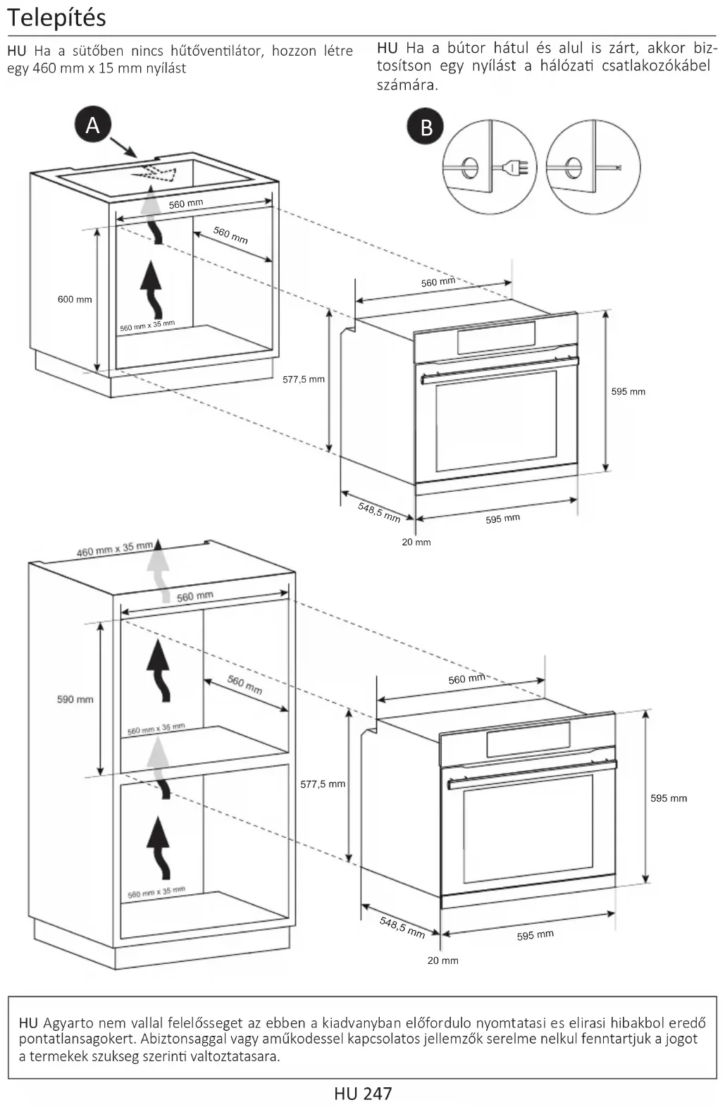 - Der Backofen kann oben in einem Einbauschrank oder unter der Arbeitsäche eingebaut werden. Vor dem Fixieren muss gewährleistet sein, dass im Backofenraum genügend Frischlu zirkulieren kann, um die Kühlung und den Schutz der innenliegen- den Teile zu gewährleisten. Je nach Einbauart die auf der letzten Seite angegebenen Önungen vornehmen.