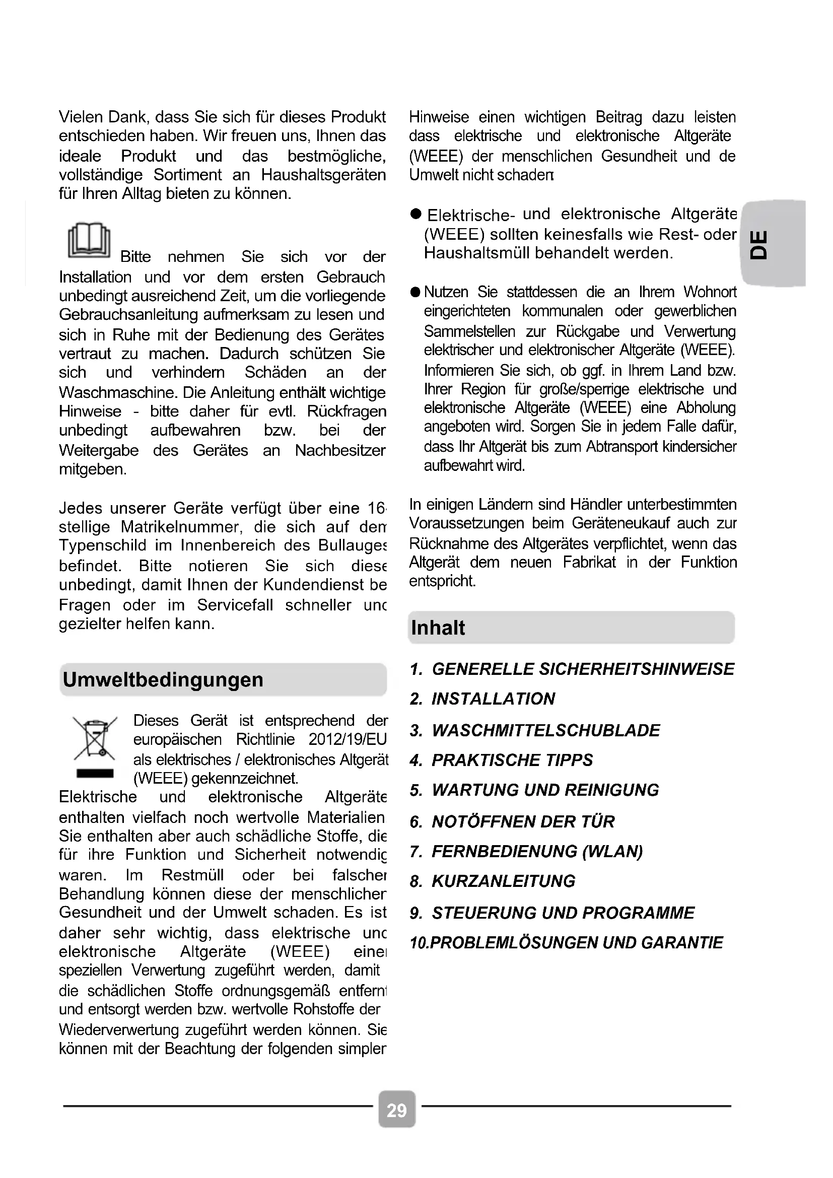 Bitte nehmen Sie sich vor der Installation und vor dem ersten Gebrauch unbedingt ausreichend Zeit, um die vorliegende Gebrauchsanleitung aufmerksam zu lesen und sich in Ruhe mit der Bedienung des Gerätes vertraut zu machen. Dadurch schützen Sie sich und verhindern Schäden an der Waschmaschine. Die Anleitung enthält wichtige Hinweise