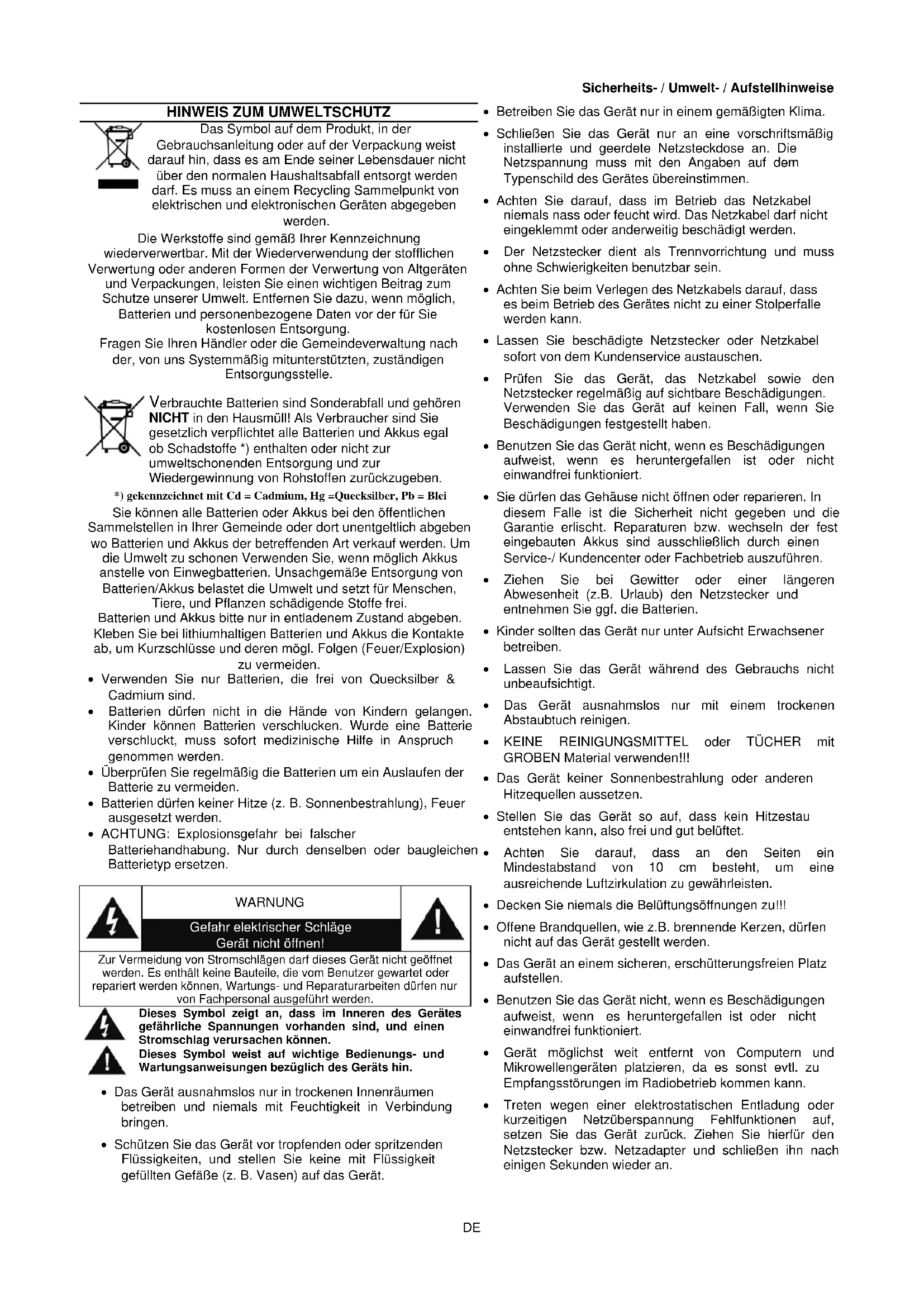 *) gekennenzeichnet mit Cd = Cadmium, Hg = Quecksilber, Pb = Blei Sie können alle Batterien oder Akkus bei den öffentlichen Sammelstellen in ihrer Gemeinde oder dort unentgeltlich abgeben wo Batterien und Akkus der betreffenden Art verkauf werden. Um die Umwelt zu schonen Verwenden Sie, wenn möglich Akkus anstelle von Einwegbatterien. Unsachgemäß Entsorgung von Batterien/Akkus belastet die Umwelt und setzen für Menschen, Tiere, und Pflanzen schädigende Stoffe frei. Batterien und Akkusitte nur in entladenem Zustand abgeben. Kleben Sie bei lithiumhaltigen Batterien und Akkus die Kontakte ab, um Kurzschlüsse und deren mögl. Folgen (Feuer/Explosion) zu vermeiden.