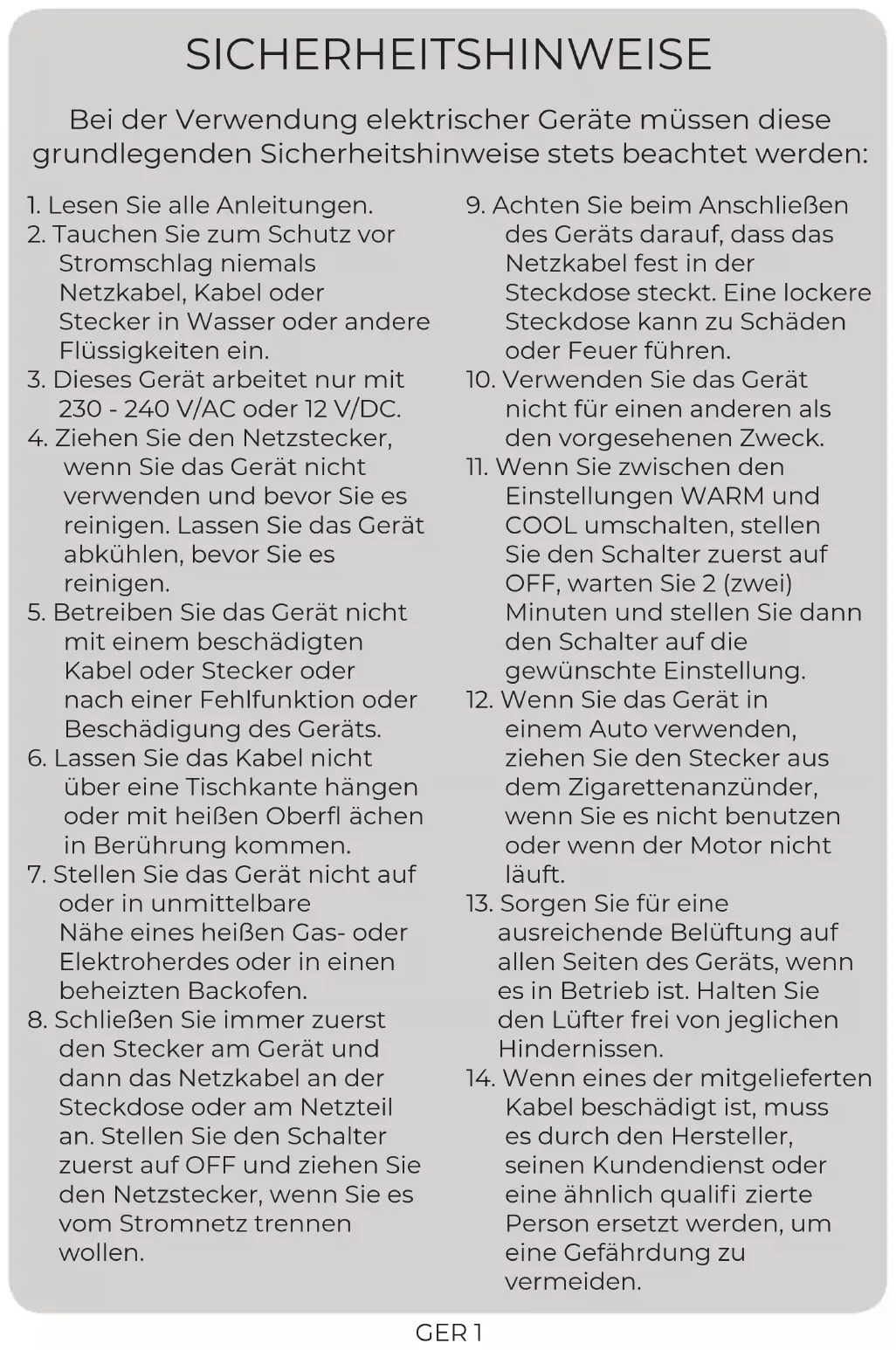 Die Verwendung von Verlängerungskabeln wird für dieses Produkt nicht empfohlen.GER 3 Lieferumfang Mini-Kühlschrank, AC-Netzkabel, DC-Anschlusskabel, Bedienungsanleitung, Kundenbewertungskarte Bedienelemente Integrierter Griff Matte Türoberfl äche Türgriff Rote und grüne Kontrollanzeigen COOL/OFF/WARM-Umschalter DC-Eingang AC-Eingang Herausnehmbarer Einlegeboden UV-Licht UV-Lichtschalter AC-Netzkabel DC-Anschlusskabel