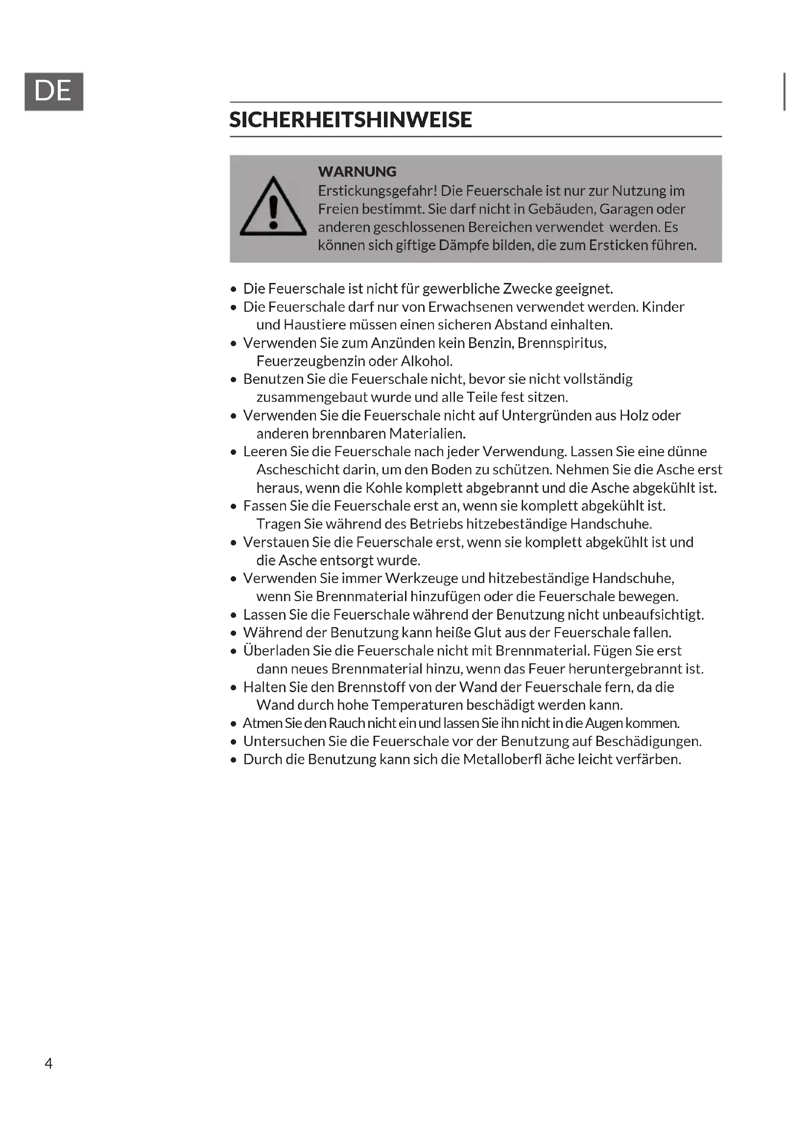 Erstickungsgefahr! Die Feuerschale ist nur zur Nutzung im Freien bestimmt. Sie darf nicht in Gebäuden, Garagen oder anderen geschlossenen Bereichen verwendet werden. Es konnen sich giftige Dämpfe bilden, die zum Ersticken führen.