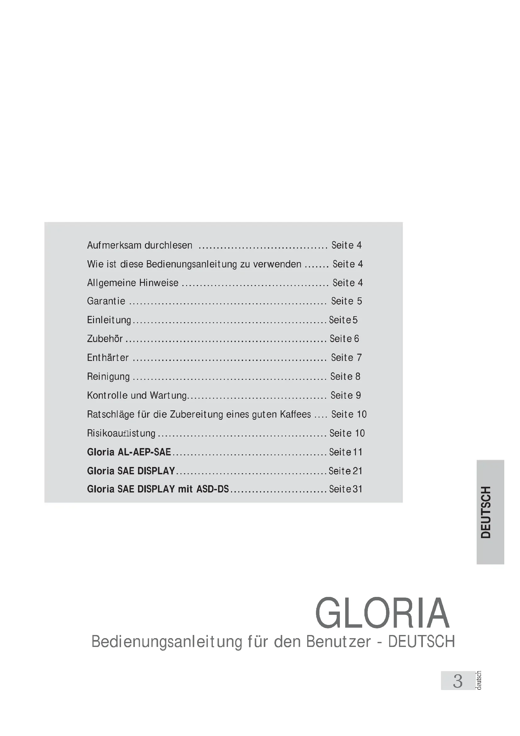 reg. softener 00000 reg. softener 00000GLORIA ASD - Automatic Steamer Device DS - Drink Selection SAE DISPLAY AL-AEP-SAE Bedienungsanleitung für den Benutzer - DEUTSCH SAE DISPLAY DEUTSCH3 deutsch DEUTSCH GLORIA Bedienungsanleitung für den Benutzer - DEUTSCH Aufmerksam durchlesen .................................... Seite 4 Wie ist diese Bedienungsanleitung zu verwenden ....... Seite 4 Allgemeine Hinweise ......................................... Seite 4 Garantie ....................................................... Seite 5 Einleitung ...................................................... Seite 5 Zubehör ........................................................ Seite 6 Enthärter ...................................................... Seite 7 Reinigung ...................................................... Seite 8 Kontrolle und Wartung....................................... Seite 9 Ratschläge für die Zubereitung eines guten Kaffees .... Seite 10 Risikoaufl istung ............................................... Seite 10 Gloria AL-AEP-SAE ........................................... Seite 11 Gloria SAE DISPLAY .......................................... Seite 21 Gloria SAE DISPLAY mit ASD-DS ........................... Seite 314 deutsch ALLGEMEINE HINWEISE Vor der Benutzung des Produktes, dieses Handbuch ganz durchlesen. Die Espresso-Kaffeemaschine, die Sie gekauft haben wurde nach modernsten Methoden und innovativen Techno- logien geplant und hergestellt, die Ihnen Qualität und Zuverlässigkeit über Jahre garantieren. Dieses Handbuch ermöglicht es Ihnen, die Vorteile kennen zu lernen, die Ihnen aufgrund Ihrer Wahl geboten werden. Sie finden hier alle Anleitungen bezüglich der optimalsten Ausnutzung der Maschinenleistung, der Art und Weise um deren Leistungsfähigkeit stets zu gewährleisten und wie man sich im Falle des Auftretens von Problemen verhalten soll. Bewahren Sie dieses Handbuch sorgfältig an einem geschützten Ort auf. Sollte es verloren gehen, fordern Sie bitte beim Hersteller ein Ersatzexemplar an. VIEL SPASS BEIM LESEN UND … EINEN GUTEN KAFFEE Der Hersteller behält sich das Recht vor, Verbesserungen am Produkt vorzunehmen. Wir garantieren hiermit, dass dieses Handbuch den aktuellen Stand der Technik zum Zeitpunkt der Vermarktung der Maschine wiederspiegelt. Bei dieser Gelegenheit bitten wir unsere verehrte Kundschaft sich mit Besserungsvorschlägen, bezüglich des Produktes oder dieses Handbuchs direkt an uns zu wenden.