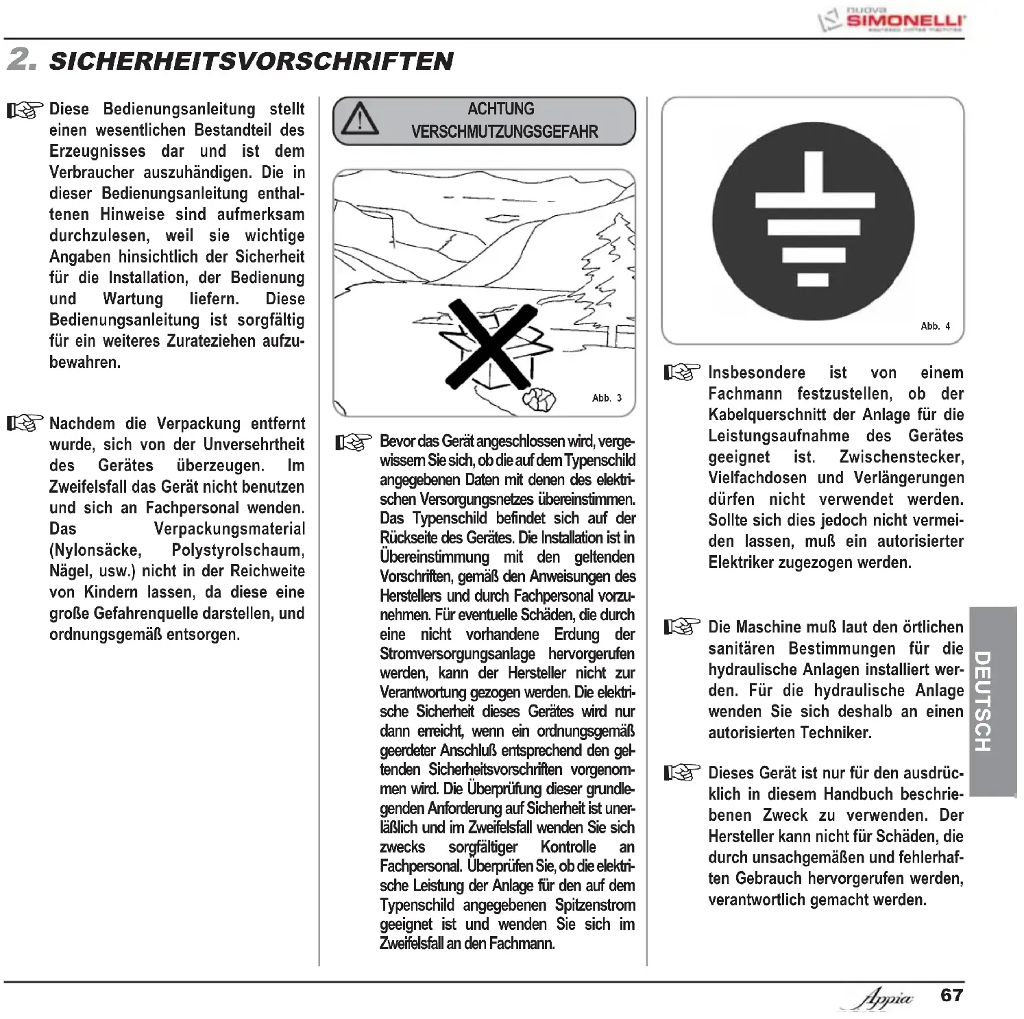 NUR der spezialisierte Fachmann darf die nachstehend beschriebenen Regelungen durchführen. Die Nuova Simonelli kann für keinerlei Sach- oder Personenschäden haftbar gemacht werden, die auf die Nichtbeachtung der in dieser Anleitung genannten Sicherheitsvorschriften zurück- zuführen sind. ACHTUNG ACHTUNG STROMSCHLAGGEFAHR Der spezialisierte Fachmann hat den Maschinenschalter abzuschalten und den Stecker vom Stromnetz abzutrennen, bevor er Regelungen vornimmt. 3_Appia1GR_D.qxp 18-01-2006 17:36 Pagina 7273 DEUTSCH Der Bediener hat vor dem Gebrauch der Maschine die Sicherheitsvorschriften dieser Anleitung zu lesen und zu verstehen.