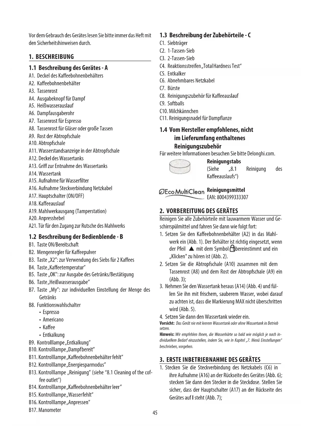 - Verwenden Sie ausschließlich Entkalker von De'Longhi. Die Verwendung von ungeeigneten Entkalkern sowie die nicht regelmäßig durchgeführte Entkalkung konnen zum Auftreten vom Defekten führen, die nicht durch die Hersteller-garantie abgedeckt sind.