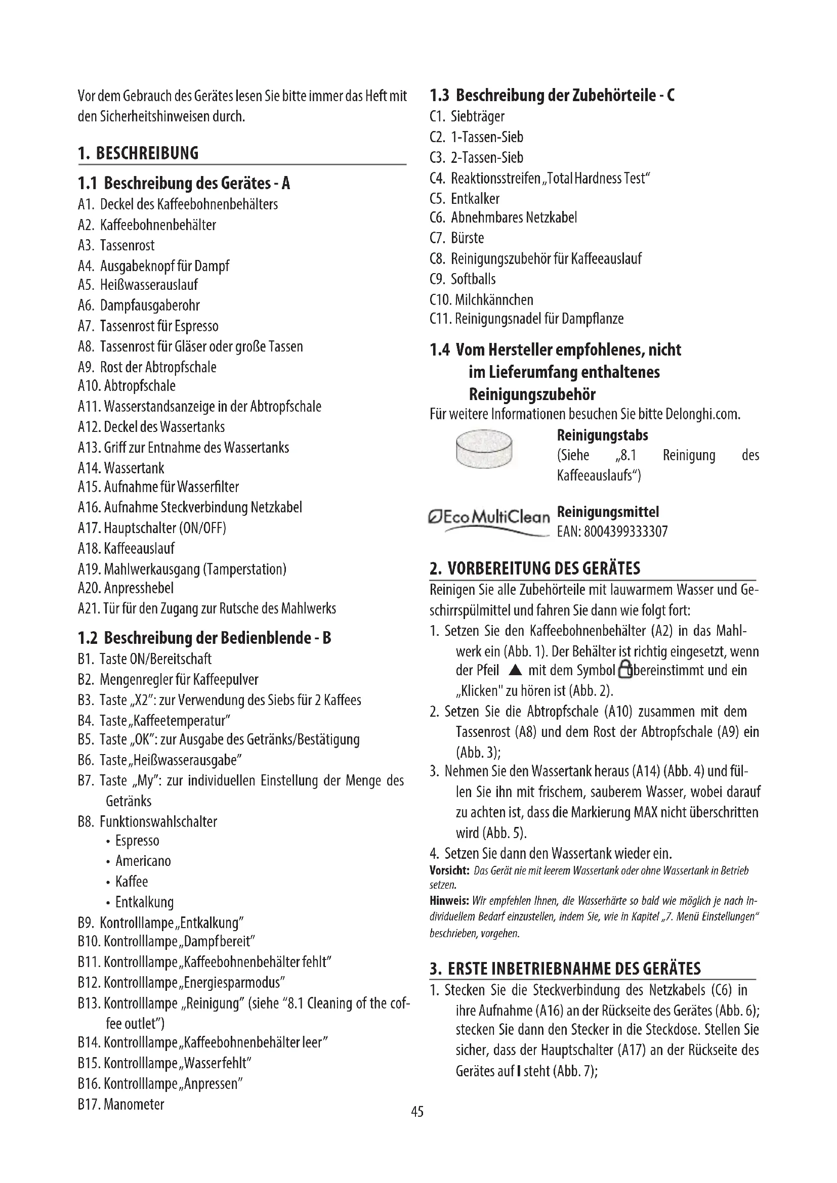 - Verwenden Sie ausschließlich Entkalker von De’Longhi. Die Verwendung von ungeeigneten Entkalkern sowie die nicht regelmäßig durchgeführte Entkalkung können zum Auf- treten vom Defekten führen, die nicht durch die Hersteller- garantie abgedeckt sind.