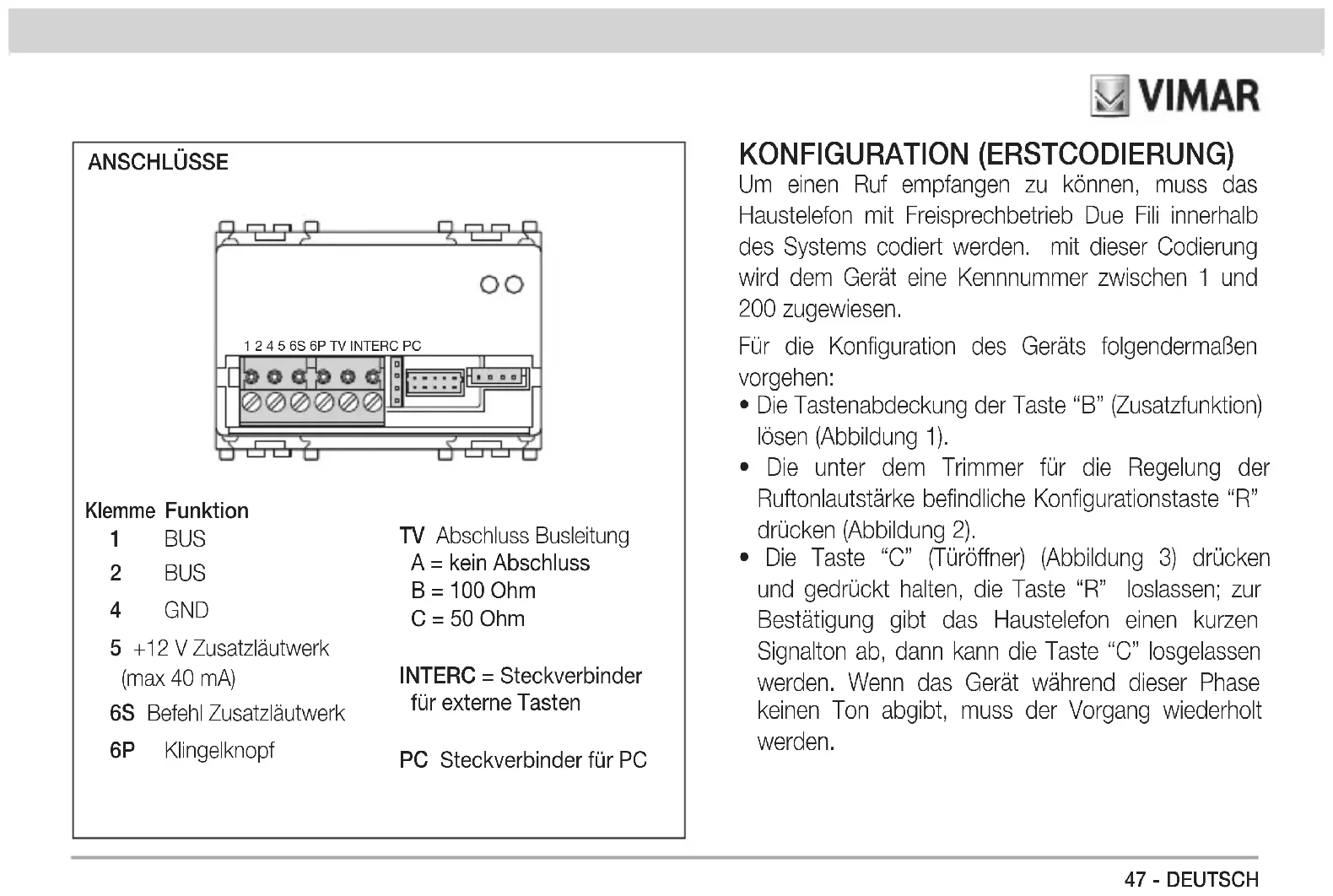 - Die Taste “C” (Türöffner) (Abbildung 3) drücken und gedrückt halten, die Taste “R” loslassen; zur Bestätigung gibt das Haustelefon einen kurzen Signalton ab, dann kann die Taste “C” losgelassen werden. Wenn das Gerät während dieser Phase keinen Ton abgibt, muss der Vorgang wiederholt werden. Klemme Funktion 1 BUS 2 BUS 4 GND 5 +12 V Zusatzläutwerk (max 40 mA) 6S Befehl Zusatzläutwerk 6P Klingelknopf TV Abschluss Busleitung A = kein Abschluss B = 100 Ohm C = 50 Ohm INTERC = Steckverbinder für externe Tasten PC Steckverbinder für PC ANSCHLÜSSE 1 2 4 5 6S 6P TV INTERC PC48 - DEUTSCH ZWEITCODIERUNG (Gruppenrufe) Derselbe Ruf kann gleichzeitig an mehrere Haustelefone/ Videohaustelefone geleitet werden (“Gruppenruf”), sodass der Ruf an das Hauptgerät von allen Haustelefonen/ Videohaustelefonen, die zur selben Gruppe gehören, beant- wortet werden kann. Das Hauptgerät ist ein Haustelefon/ Videohaustelefon, das direkt codiert und einem externen Ruf von der Türstation zugewiesen ist. Wenn das Haustelefon als Zweitgerät eines bestimmten Hauptgeräts programmiert werden soll, die Codierungstaste “R” drücken, die sich unter dem Trimmer für die Regelung der Ruftonlautstärke befindet (Abbildung 2) und anschlie