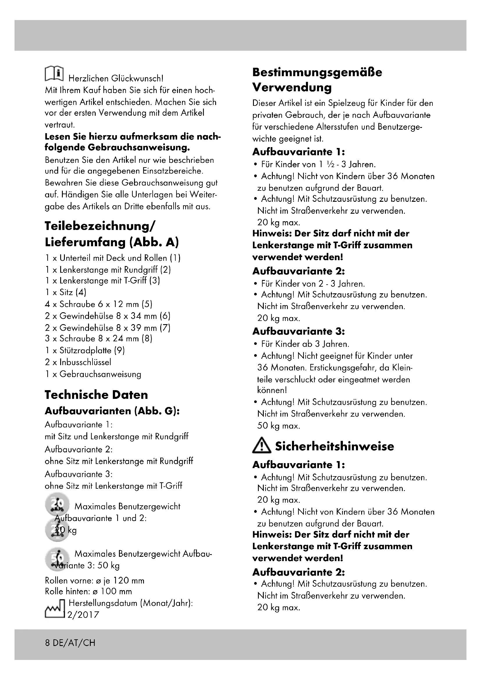 Herzlichen Glückwunsch! Mit Ihrem Kauf haben Sie sich für einen hoch- wertigen Artikel entschieden. Machen Sie sich vor der ersten Verwendung mit dem Artikel vertraut. Lesen Sie hierzu aufmerksam die nach- folgende Gebrauchsanweisung. Benutzen Sie den Artikel nur wie beschrieben und für die angegebenen Einsatzbereiche. Bewahren Sie diese Gebrauchsanweisung gut auf. Händigen Sie alle Unterlagen bei Weiter- gabe des Artikels an Dritte ebenfalls mit aus. Teilebezeichnung/ Lieferumfang (Abb. A) 1 x Unterteil mit Deck und Rollen (1) 1 x Lenkerstange mit Rundgriff (2) 1 x Lenkerstange mit T-Griff (3) 1 x Sitz (4) 4 x Schraube 6 x 12 mm (5) 2 x Gewindehülse 8 x 34 mm (6) 2 x Gewindehülse 8 x 39 mm (7) 3 x Schraube 8 x 24 mm (8) 1 x Stützradplatte (9) 2 x Inbusschlüssel 1 x Gebrauchsanweisung Technische Daten Aufbauvarianten (Abb. G): Aufbauvariante 1: mit Sitz und Lenkerstange mit Rundgriff Aufbauvariante 2: ohne Sitz mit Lenkerstange mit Rundgriff Aufbauvariante 3: ohne Sitz mit Lenkerstange mit T-Griff Maximales Benutzergewicht Aufbauvariante 1 und 2: 20 kg Maximales Benutzergewicht Aufbau- variante 3: 50 kg Rollen vorne: ø je 120 mm Rolle hinten: ø 100 mm Herstellungsdatum (Monat/Jahr): 12/2017 Bestimmungsgemäße Verwendung Dieser Artikel ist ein Spielzeug für Kinder für den privaten Gebrauch, der je nach Aufbauvariante für verschiedene Altersstufen und Benutzerge- wichte geeignet ist. Aufbauvariante 1:
