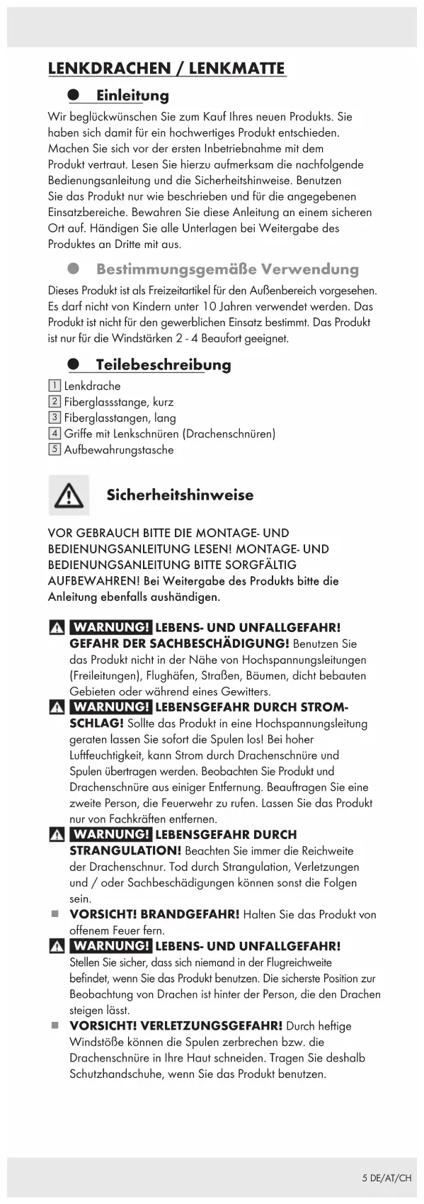 WARNING! LEBENSGEFAHR DURING STROM-SCHLAG! Sollte das Produkt in eine Hochspannungsleitung geraten lassen Sie那么简单 die Spulen los! Bei hoher Luftfeuchtigkeit, kann Strom durch Drachenschnüre und Spulen übertragen werden. Beobachten Sie Produkt und Drachenschnüre aus einiger Entfernung. Beauftragen Sie eine zweite Person, die Feuerwehr zu rufen. Lassen Sie das Produkt nur von Fachkraften halten.