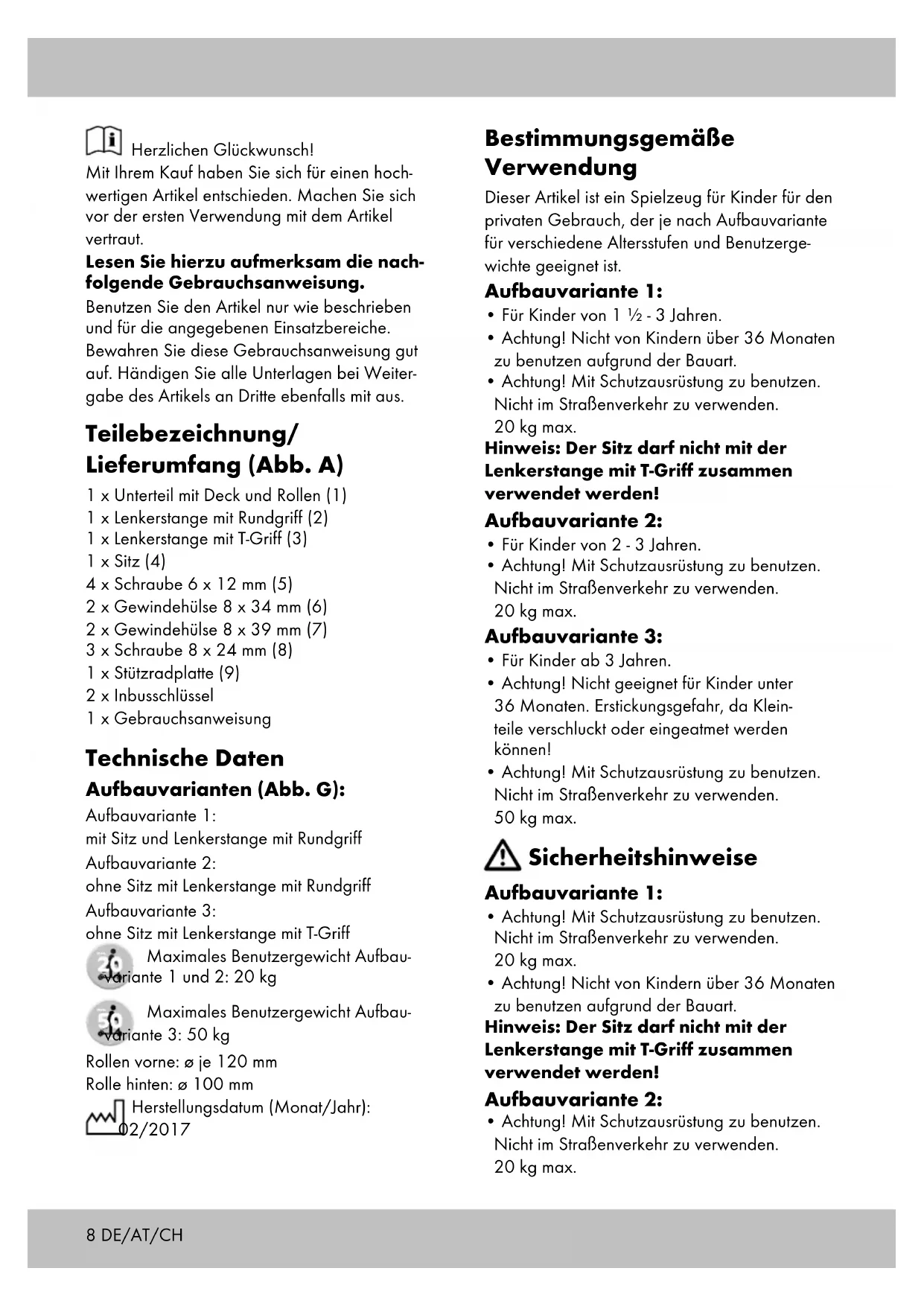 Herzlichen Glückwunsch! Mit Ihrem Kauf haben Sie sich für einen hoch- wertigen Artikel entschieden. Machen Sie sich vor der ersten Verwendung mit dem Artikel vertraut. Lesen Sie hierzu aufmerksam die nach- folgende Gebrauchsanweisung. Benutzen Sie den Artikel nur wie beschrieben und für die angegebenen Einsatzbereiche. Bewahren Sie diese Gebrauchsanweisung gut auf. Händigen Sie alle Unterlagen bei Weiter- gabe des Artikels an Dritte ebenfalls mit aus. Teilebezeichnung/ Lieferumfang (Abb. A) 1 x Unterteil mit Deck und Rollen (1) 1 x Lenkerstange mit Rundgriff (2) 1 x Lenkerstange mit T-Griff (3) 1 x Sitz (4) 4 x Schraube 6 x 12 mm (5) 2 x Gewindehülse 8 x 34 mm (6) 2 x Gewindehülse 8 x 39 mm (7) 3 x Schraube 8 x 24 mm (8) 1 x Stützradplatte (9) 2 x Inbusschlüssel 1 x Gebrauchsanweisung Technische Daten Aufbauvarianten (Abb. G): Aufbauvariante 1: mit Sitz und Lenkerstange mit Rundgriff Aufbauvariante 2: ohne Sitz mit Lenkerstange mit Rundgriff Aufbauvariante 3: ohne Sitz mit Lenkerstange mit T-Griff Maximales Benutzergewicht Aufbau- variante 1 und 2: 20 kg Maximales Benutzergewicht Aufbau- variante 3: 50 kg Rollen vorne: ø je 120 mm Rolle hinten: ø 100 mm Herstellungsdatum (Monat/Jahr): 02/2017 Bestimmungsgemäße Verwendung Dieser Artikel ist ein Spielzeug für Kinder für den privaten Gebrauch, der je nach Aufbauvariante für verschiedene Altersstufen und Benutzerge- wichte geeignet ist. Aufbauvariante 1: