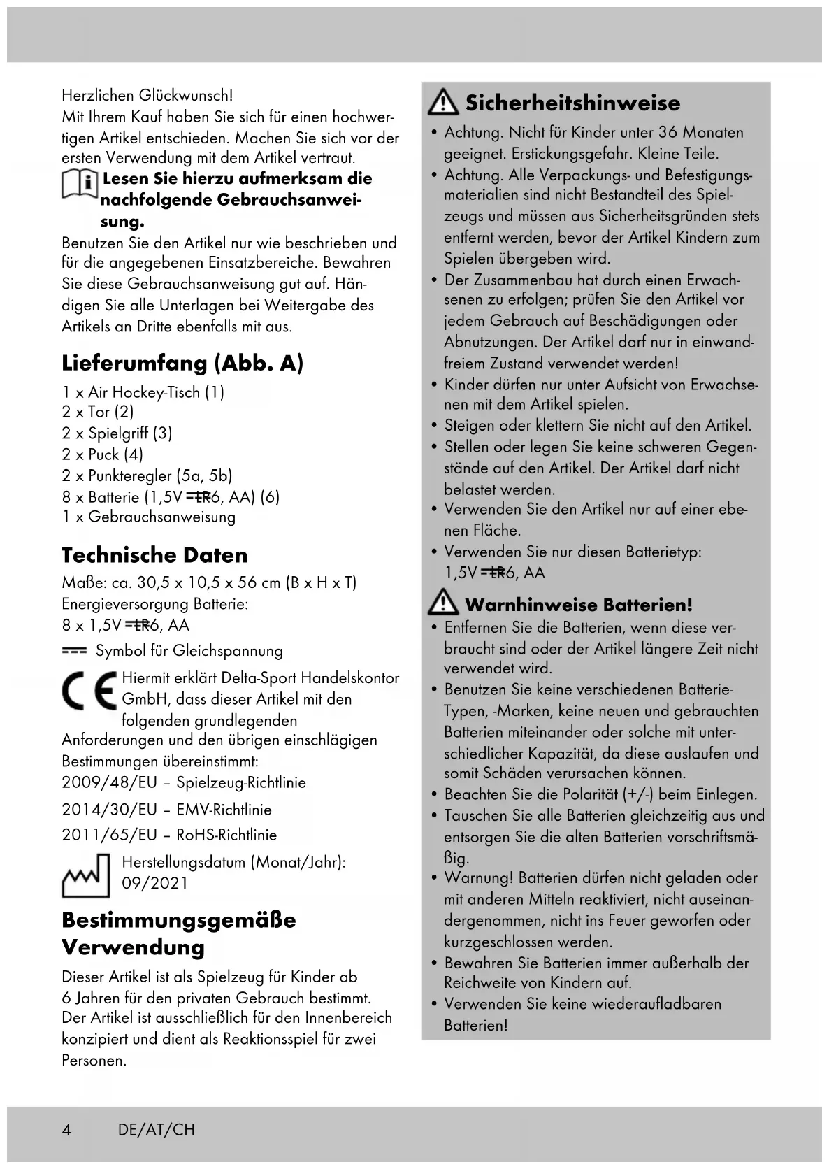 Herzlichen Glückwunsch! Mit Ihrem Kauf haben Sie sich für einen hochwer- tigen Artikel entschieden. Machen Sie sich vor der ersten Verwendung mit dem Artikel vertraut. Lesen Sie hierzu aufmerksam die nachfolgende Gebrauchsanwei- sung. Benutzen Sie den Artikel nur wie beschrieben und für die angegebenen Einsatzbereiche. Bewahren Sie diese Gebrauchsanweisung gut auf. Hän- digen Sie alle Unterlagen bei Weitergabe des Artikels an Dritte ebenfalls mit aus. Lieferumfang (Abb. A) 1 x Air Hockey-Tisch (1) 2 x Tor (2) 2 x Spielgriff (3) 2 x Puck (4) 2 x Punkteregler (5a, 5b) 8 x Batterie (1,5V LR6, AA) (6) 1 x Gebrauchsanweisung Technische Daten Maße: ca. 30,5 x 10,5 x 56 cm (B x H x T) Energieversorgung Batterie: 8 x 1,5V LR6, AA Symbol für Gleichspannung Hiermit erklärt Delta-Sport Handelskontor GmbH, dass dieser Artikel mit den folgenden grundlegenden Anforderungen und den übrigen einschlägigen Bestimmungen übereinstimmt: 2009/48/EU – Spielzeug-Richtlinie 2014/30/EU – EMV-Richtlinie 2011/65/EU – RoHS-Richtlinie Herstellungsdatum (Monat/Jahr): 09/2021 Bestimmungsgemäße Verwendung Dieser Artikel ist als Spielzeug für Kinder ab 6 Jahren für den privaten Gebrauch bestimmt. Der Artikel ist ausschließlich für den Innenbereich konzipiert und dient als Reaktionsspiel für zwei Personen. Sicherheitshinweise