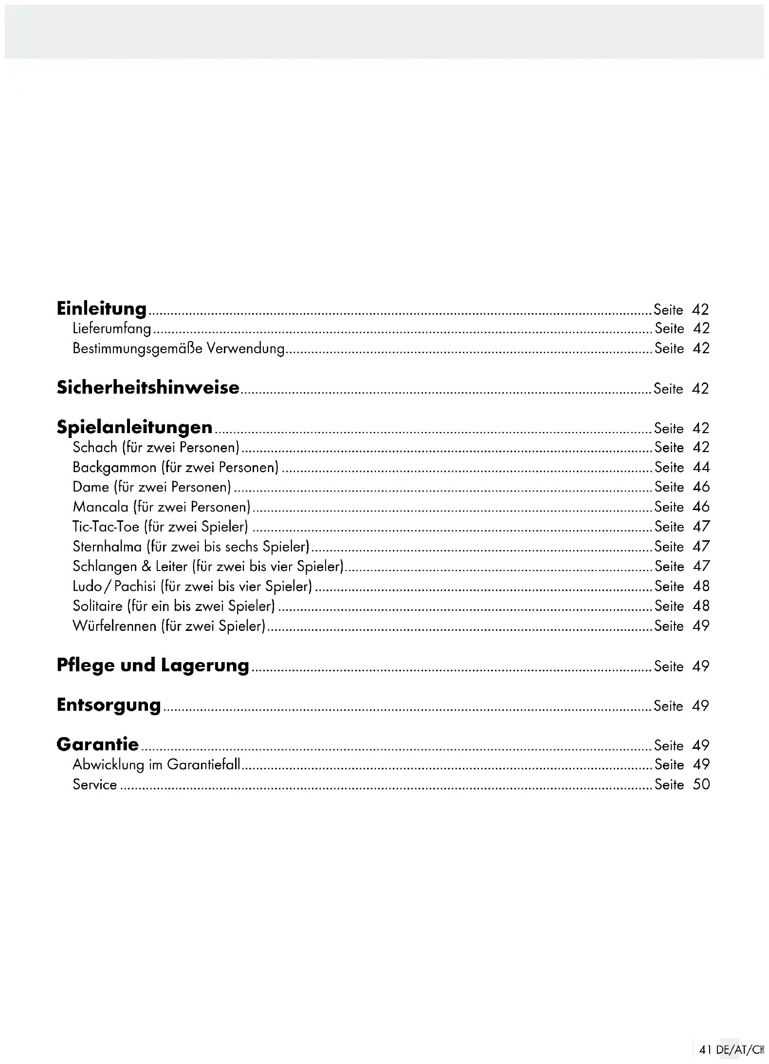 gewertet. Sternhalma (für zwei bis sechs Spieler) Spielmaterial: 60 Spielkugeln (jeweils 10 Kugeln in 6 Farben) 1 Spielbrett 1 Spielanleitung Spielvorbereitung und Ziel des Spiels: Jeder Spieler legt seine Spielkugeln in eines der sechs farbigen Dreiecke. Jedem Spieler wird eine Farbe zugeteilt. Daraus ergibt sich auch die Wahl seines Start- und Zielfeldes sowie seiner Spielkugeln. Wer zuerst seine 10 Spiel- kugeln in das gegenüberliegende Dreieck bringt, hat das Spiel gewonnen. Verlauf des Spiels: Bestimmen Sie einen Spieler, der beginnt. Ab- wechselnd darf nach der Reihe jeder Spieler mit einer seiner Spielkugeln einen Zug ausführen. Dabei sind zwei Spielzüge erlaubt: das Ziehen oder das Springen. Beim Ziehen bewegt der Spieler nur eine Spiel- kugel. Die Kugel kann in alle Richtungen einen Schritt ziehen. Ist ein Zugfeld durch eine eigene oder eine gegnerische Kugel besetzt, kann der Spieler diese in der Zugrichtung überspringen. Voraus- setzung ist, dass das Feld hinter der übersprun- genen Kugel frei ist. Der Spieler muss sich bei jedem Zug zwischen Ziehen oder Springen entscheiden. Beides zu- sammen ist nicht erlaubt. Springen dürfen Sie so lange wie möglich. Sie werden aber nicht dazu gezwungen. Ist eine Spielkugel einmal im Zielfeld angelangt, darf diese es nicht mehr verlassen. Schlangen & Leiter (für zwei bis vier Spieler) Spielmaterial: 4 Ludo-Spielfiguren (jeweils 1 Figur in 4 Farben) 1 Würfel 1 Spielbrett 1 Spielanleitung Spielvorbereitung und Ziel des Spiels: Jeder Spieler erhält eine Spielfigur und stellt sie auf das gleichfarbige Startfeld. Wer zuerst mit seiner Spielfigur das Zielfeld erreicht, hat das Spiel gewonnen.48 DE/AT/CH Verlauf des Spiels: Bestimmen Sie einen Spieler, der zuerst würfelt. Entsprechend der gewürfelten Augenzahl darf der Spieler mit seiner Spielfigur vorziehen. Danach wird reihum weitergespielt. Landet ein Spieler am Ende seines Zuges auf einem Feld mit einer Leiter, darf er diese hinauf- klettern. Landet ein Spieler am Ende seines Zuges auf einem Feld mit einem Schlangenkopf, muss er zum Schwanz der Schlange zurückkehren. Landet der Spieler auf einem Feld, auf dem bereits eine gegnerische Spielfigur steht, so wird die Spielfigur geschlagen und der Gegner muss zurück zum Start. Zeigt der Würfel eine 6, darf der Spieler erneut würfeln. Sie benötigen die exakte Augenzahl, um auf dem Zielfeld zu landen. Ludo / Pachisi (für zwei bis vier Spieler) Spielmaterial: 16 Ludo-Spielfiguren (jeweils 4 Figuren in 4 Farben) 1 Würfel 1 Spielbrett 1 Spielanleitung Spielvorbereitung und Ziel des Spiels: Jeder Spieler erhält 4 Spielfiguren in einer Farbe und stellt sie in das entsprechende Starthäuschen. Gewonnen hat, wer als erstes mit seinen 4 Spielfiguren das Zielhäuschen erreicht. Verlauf des Spiels: Bestimmen Sie einen Spieler, der zuerst würfelt. Danach wird reihum weitergespielt. Jeder Spieler darf 3 Mal würfeln. Wer eine 6 hat, darf eine Spielfigur aus dem Starthäuschen auf das Startfeld stellen. Anschließend würfelt der Spieler erneut und rückt die gewürfelte Zahl vor. Solange ein Spieler alle 4 Spielfiguren im Starthäuschen hat, darf er 3 Mal würfeln. Würfelt ein Spieler erneut eine 6, kann er selbst entscheiden, eine weitere Spielfigur ins Spiel zu bringen oder mit einer Spielfigur 6 Felder vorzurücken. Nach jeder 6 darf man erneut würfeln. Kommt ein Spieler auf ein Feld, auf dem eine gegnerische Spielfigur steht, kann man diese schlagen. Die Spielfigur des Gegenspielers muss dann zurück in das Starthäuschen und kann mit einer 6 erneut ins Spiel gebracht werden. Ist ein Feld mit einer eigenen Spielfigur besetzt, muss man den Zug mit einer anderen Figur machen. Doppelte Belegung ist nicht erlaubt. Im Zielhäuschen sind die Spielfiguren sicher und können nicht geschlagen werden. Die Figuren, die bereits das Zielhäuschen erreicht haben, dürfen nicht übersprungen werden. Solitaire (für ein bis zwei Spieler) Spielmaterial: 32 Spielsteine 1 Spielbrett 1 Spielanleitung Spielvorbereitung und Ziel des Spiels: Die 32 Spielsteine werden so auf dem Spiel- feld verteilt, dass nur das Feld in der Mitte frei bleibt. Ziel des Spiels ist es, dass am Ende ein Spielstein in der Mitte übrigbleibt. Verlauf des Spiels: Entfernen Sie so viele Spielsteine wie möglich, indem Sie horizontal oder vertikal über einen anderen Stein springen. Sie dürfen immer nur über einen Spielstein springen und das Feld, auf dem sie landen, muss leer sein. Bei 2 Spielern wird immer abwechselnd gezogen. Wenn ein Spieler keinen Spielzug durchführen kann, hat er das Spiel verloren.49 DE/AT/CH Würfelrennen (für zwei Spieler) Spielmaterial: 30 Spielsteine (15 weiße, 15 schwarze) 2 Würfel 1 Spielbrett 1 Spielanleitung Spielvorbereitung und Ziel des Spiels: Jeder Spieler erhält jeweils 15 weiße bzw. schwarze Spielsteine. Bestimmen Sie einen Spieler der beginnt. Wer am Ende des Spiels die meisten Steine auf dem Spielfeld hat, hat das Spiel gewonnen. Verlauf des Spiels: Beide Würfel werden gleichzeitig geworfen. Die gewürfelten Zahlen werden zusammen- gerechnet. Anschließend platziert der Spieler einen Spielstein auf dem entsprechenden Spielfeld. Anschließend ist der andere Spieler an der Reihe. Würfelt er das gleiche Ergebnis wie sein Gegenspieler, darf er keinen Spielstein auf dem Spielfeld platzieren. Es wird so lange gespielt, bis alle Felder belegt sind. Pflege und Lagerung Lagern Sie das Produkt immer trocken und sauber in einem temperierten Raum. Reinigen Sie das Produkt nicht mit scharfen Reinigungsmitteln, nutzen Sie lediglich ein trockenes Reinigungstuch. Entsorgung Die Verpackung besteht aus umweltfreundlichen Materialien, die Sie über die örtlichen Recycling- stellen entsorgen können. Möglichkeiten zur Entsorgung des ausgedienten Produkts erfahren Sie bei Ihrer Gemeinde- oder Stadtverwaltung. Garantie Das Produkt wurde nach strengen Qualitätsrichtlinien sorgfältig produziert und vor Anlieferung gewissen- haft geprüft. Im Falle von M