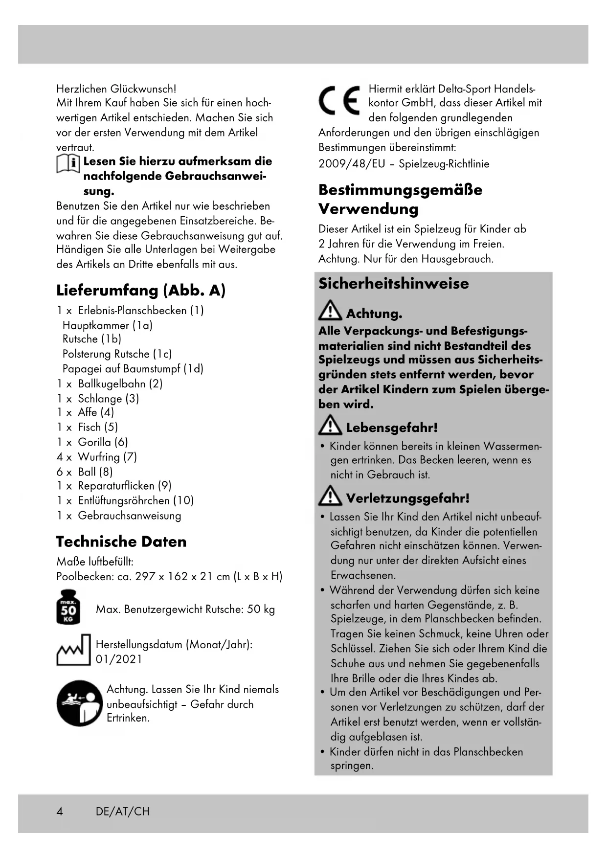 Herzlichen Glückwunsch! Mit Ihrem Kauf haben Sie sich für einen hoch- wertigen Artikel entschieden. Machen Sie sich vor der ersten Verwendung mit dem Artikel vertraut. Lesen Sie hierzu aufmerksam die nachfolgende Gebrauchsanwei- sung. Benutzen Sie den Artikel nur wie beschrieben und für die angegebenen Einsatzbereiche. Be- wahren Sie diese Gebrauchsanweisung gut auf. Händigen Sie alle Unterlagen bei Weitergabe des Artikels an Dritte ebenfalls mit aus. Lieferumfang (Abb. A) 1 x Erlebnis-Planschbecken (1) Hauptkammer (1a) Rutsche (1b) Polsterung Rutsche (1c) Papagei auf Baumstumpf (1d) 1 x Ballkugelbahn (2) 1 x Schlange (3) 1 x Affe (4) 1 x Fisch (5) 1 x Gorilla (6) 4 x Wurfring (7) 6 x Ball (8) 1 x Reparaturflicken (9) 1 x Entlüftungsröhrchen (10) 1 x Gebrauchsanweisung Technische Daten Maße luftbefüllt: Poolbecken: ca. 297 x 162 x 21 cm (L x B x H) Max. Benutzergewicht Rutsche: 50 kg Herstellungsdatum (Monat/Jahr): 01/2021 Achtung. Lassen Sie Ihr Kind niemals unbeaufsichtigt – Gefahr durch Ertrinken. Hiermit erklärt Delta-Sport Handels- kontor GmbH, dass dieser Artikel mit den folgenden grundlegenden Anforderungen und den übrigen einschlägigen Bestimmungen übereinstimmt: 2009/48/EU – Spielzeug-Richtlinie Bestimmungsgemäße Verwendung Dieser Artikel ist ein Spielzeug für Kinder ab 2 Jahren für die Verwendung im Freien. Achtung. Nur für den Hausgebrauch. Sicherheitshinweise Achtung. Alle Verpackungs- und Befestigungs- materialien sind nicht Bestandteil des Spielzeugs und müssen aus Sicherheits- gründen stets entfernt werden, bevor der Artikel Kindern zum Spielen überge- ben wird. Lebensgefahr!
