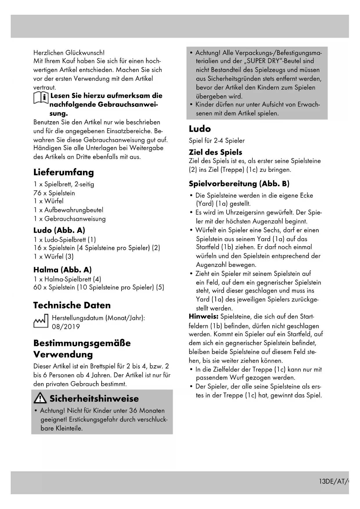 - Kinder dürfen nur unter Aufsicht von Erwach- senen mit dem Artikel spielen. Ludo Spiel für 2-4 Spieler Ziel des Spiels Ziel des Spiels ist es, als erster seine Spielsteine (2) ins Ziel (Treppe) (1c) zu bringen. Spielvorbereitung (Abb. B)