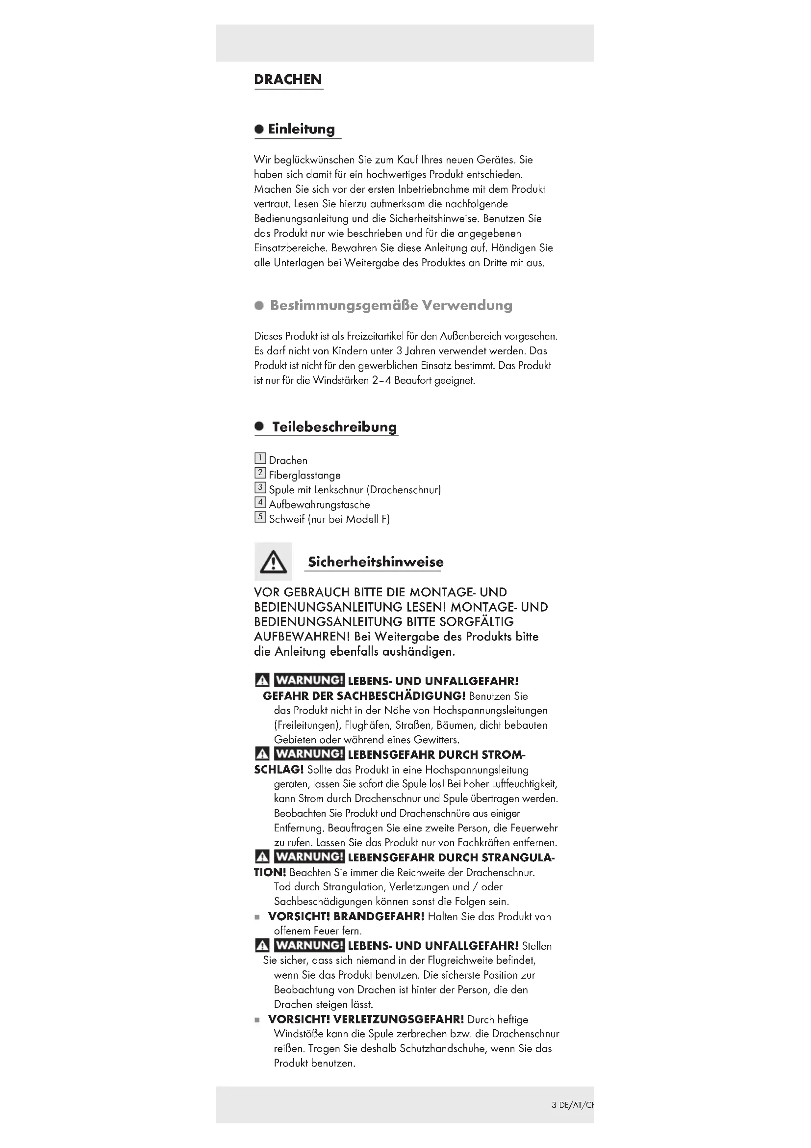 TION! Beachten Sie immer die Reichweite der Drachenschnur. Tod durch Strangulation, Verletzungen und / oder Sachbeschädigungen können sonst die Folgen sein. VORSICHT! BRANDGEFAHR! Halten Sie das Produkt von offenem Feuer fern. LEBENS- UND UNFALLGEFAHR! Stellen Sie sicher, dass sich niemand in der Flugreichweite befindet, wenn Sie das Produkt benutzen. Die sicherste Position zur Beobachtung von Drachen ist hinter der Person, die den Drachen steigen lässt. VORSICHT! VERLETZUNGSGEFAHR! Durch heftige Windstöße kann die Spule zerbrechen bzw. die Drachenschnur reißen. Tragen Sie deshalb Schutzhandschuhe, wenn Sie das Produkt benutzen.4 DE / AT / CH
