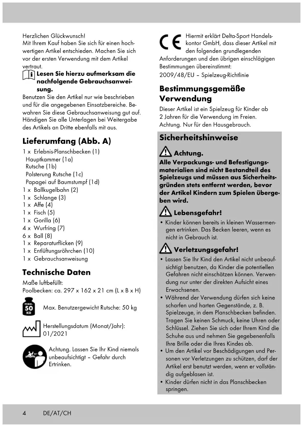 Herzlichen Glückwunsch! Mit Ihrem Kauf haben Sie sich für einen hoch- wertigen Artikel entschieden. Machen Sie sich vor der ersten Verwendung mit dem Artikel vertraut. Lesen Sie hierzu aufmerksam die nachfolgende Gebrauchsanwei- sung. Benutzen Sie den Artikel nur wie beschrieben und für die angegebenen Einsatzbereiche. Be- wahren Sie diese Gebrauchsanweisung gut auf. Händigen Sie alle Unterlagen bei Weitergabe des Artikels an Dritte ebenfalls mit aus. Lieferumfang (Abb. A) 1 x Erlebnis-Planschbecken (1) Hauptkammer (1a) Rutsche (1b) Polsterung Rutsche (1c) Papagei auf Baumstumpf (1d) 1 x Ballkugelbahn (2) 1 x Schlange (3) 1 x Affe (4) 1 x Fisch (5) 1 x Gorilla (6) 4 x Wurfring (7) 6 x Ball (8) 1 x Reparaturflicken (9) 1 x Entlüftungsröhrchen (10) 1 x Gebrauchsanweisung Technische Daten Maße luftbefüllt: Poolbecken: ca. 297 x 162 x 21 cm (L x B x H) Max. Benutzergewicht Rutsche: 50 kg Herstellungsdatum (Monat/Jahr): 01/2021 Achtung. Lassen Sie Ihr Kind niemals unbeaufsichtigt – Gefahr durch Ertrinken. Hiermit erklärt Delta-Sport Handels- kontor GmbH, dass dieser Artikel mit den folgenden grundlegenden Anforderungen und den übrigen einschlägigen Bestimmungen übereinstimmt: 2009/48/EU – Spielzeug-Richtlinie Bestimmungsgemäße Verwendung Dieser Artikel ist ein Spielzeug für Kinder ab 2 Jahren für die Verwendung im Freien. Achtung. Nur für den Hausgebrauch. Sicherheitshinweise Achtung. Alle Verpackungs- und Befestigungs- materialien sind nicht Bestandteil des Spielzeugs und müssen aus Sicherheits- gründen stets entfernt werden, bevor der Artikel Kindern zum Spielen überge- ben wird. Lebensgefahr!