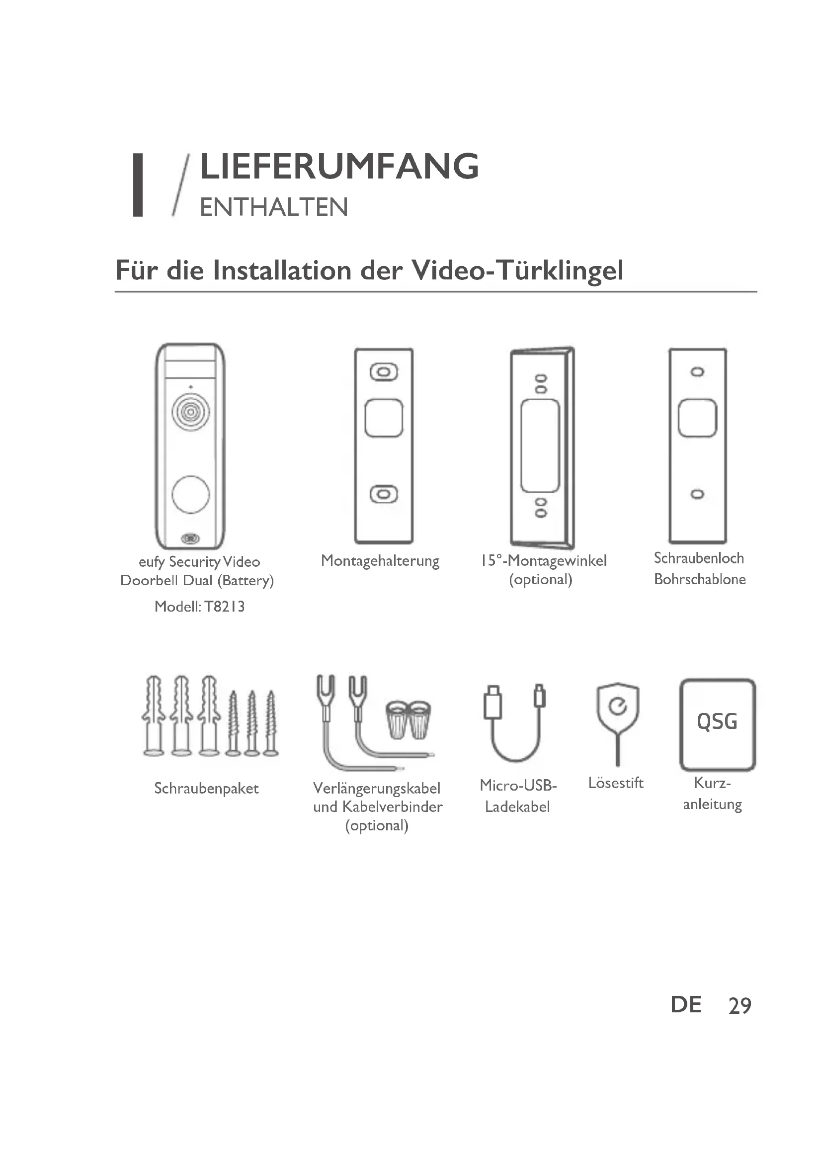 Für die Installation der Video-Türklingel QSG eufy Security Video Doorbell Dual (Battery)Modell: T8213SchraubenpaketSchraubenlochBohrschabloneMicro-USB-Ladekabel15°-Montagewinkel (optional)MontagehalterungVerlängerungskabel und Kabelverbinder (optional)LösestiftKurz-anleitung30